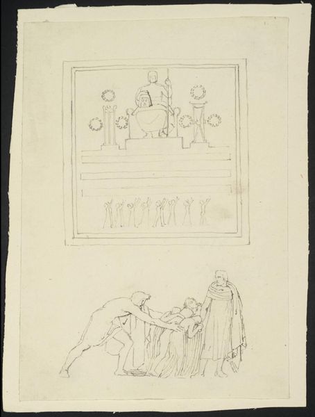 Curator: John Quincy Adams Ward created this pencil sketch, "Athena; Two Classical Figures (Possibly Venus)," sometime between 1857 and 1860. Editor: It’s so raw and ghostly, like a memory glimpsed through time. The starkness of the pencil on paper throws the classical subject matter into sharp relief. You feel the artist’s hand directly. Curator: Right! Look at the paper itself. It feels like we're peering into his studio, witnessing his process. It grounds these idealized figures in the everyday reality of artistic labor. Did he perhaps sketch it quickly during a break when modeling a marble statue in his workshop? Editor: Yes, especially with these ancient muses reduced to materials worked with through repetitive movements of production and labor, contrasting traditional boundaries of art and craft. It's a peek behind the curtain of the heroic narratives. I also appreciate seeing the subtle snake on Athena’s shield rendered so plainly. It undercuts any overblown drama or heroic pretense. Curator: The presence of the figures hints at Adams Ward’s interest in antiquity. And to think, the sketches appear within his notebook along with careful details for other classical sculptures, but they may instead suggest personal sketches, where they take on a quiet significance detached from public commissions. Editor: I agree. And think of the materiality of ancient sculptures when compared to pencil; we must discuss Adams’ fascination with stone carving when speaking about drawing these pencil works; consider labor itself. Curator: That's beautifully said, and it makes you wonder about what those fleeting sketches meant to him—the artist? It offers insight into what it meant for them to sketch Athena and other figures of Greek history so quietly in his free time! What could these drawings reveal about personal fascination with material creation during 19th century America? Editor: Ultimately, I can no longer consider history after having thought through Adams’ fascination with form, history, creation, and especially labor. Curator: What a profound idea, a pencil that reveals the weight and substance of labor.
