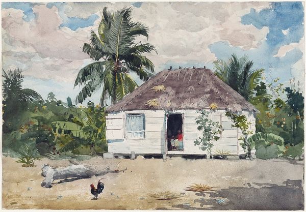 Winslow Homer created this watercolor, "A Garden in Nassau," capturing a scene bathed in tropical light. The composition is structured around a stark white wall, bisecting the space and creating a dialogue between the lush foliage and the geometric barrier. The loose brushstrokes and transparent washes of color evoke a sense of immediacy, characteristic of the watercolor medium. Homer’s application of paint is strategic, defining forms through subtle tonal variations and light effects, which articulate a semiotic system to decode the cultural and environmental elements. Note how the palm tree, a symbol of the exotic, looms over the wall, its fronds acting as a natural frame. The figure of the child introduces a human element, its placement suggesting questions about boundaries, access, and the relationship between observer and observed. The painting isn't merely a depiction of a place but an exploration of perception and representation, inviting us to reflect on the structures that shape our understanding of the world.