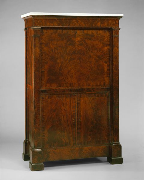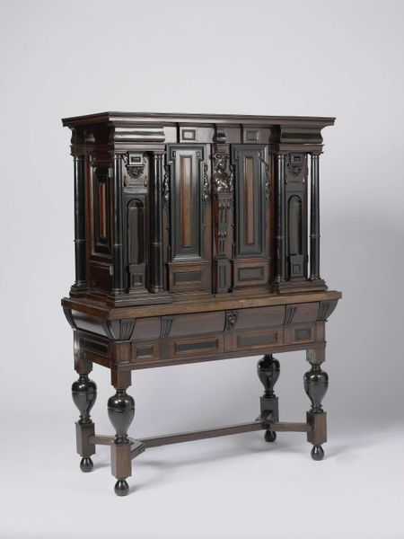 This wardrobe, or "kas" in Dutch, was made by Roelof D. Demarest, a craftsman active around the late 18th and early 19th centuries. The kas presents a striking visual experience with its symmetrical organization and emphasis on geometric shapes. Consider the interplay of dark and light wood, creating a structured pattern across the doors and base. The kas is divided into rectangular sections, each framed to draw the eye inward. The design follows a strict logic where balance is achieved through repetition and contrast. The semiotic impact of this piece lies in its ability to both serve as a functional object and communicate status and cultural values. The dark hues and solid construction convey a sense of permanence, while the geometric paneling suggests a world ordered by rational principles. It is more than storage; it reflects a structured view of the world.