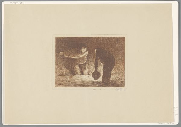 Curator: Willem de Zwart created this etching, "Two Men Working (with Ship Lantern)", in 1924. Editor: My first impression is that of profound labor, but shrouded in mystery. The figures are nearly silhouettes, working under dim light—almost swallowed by the dark. What's the mood it conjures for you? Curator: The dominant imagery here evokes a world of humble actions, imbued with dignity. Consider the light from that ship lantern—a powerful symbol in many cultures and eras. Light offers direction, but here, its limited reach suggests the focused dedication required for specific tasks. Editor: I see that—the physicality of it speaks volumes about early 20th-century labor, the print's monochromatic palette intensifying the stark conditions and perhaps long hours. I’m particularly struck by the level of craft visible in an etching like this, a kind of hands-on quality. Curator: The etching technique adds a crucial dimension. Look at the medium's capacity for detailed tonal variation and its overall subtlety—enhancing the dignity and human scale within that constrained space. Each line etched into that plate carries intention and purpose. Editor: The production value certainly complements that theme, creating an accessible artwork highlighting a familiar topic: Work, made even more visible, accessible through printmaking itself, and how these mediums and topics interact culturally. Curator: I completely agree. Its deliberate evocation connects it to the period's modernist style of everyday, mundane tasks turned grand. We must not overlook de Zwart's contribution in taking traditional painting motifs and reworking these, as seen in genre painting and figuration—transforming the symbolism. Editor: Absolutely. And viewed from a materialist perspective, we're left with considering all these hands – the hands depicted, the artist’s, the printer’s...all participating in the process of constructing meaning. Curator: It's as if de Zwart immortalizes both those working people and their context by capturing this timeless symbology that is still significant today. Editor: The artist truly shows how manual work gains both its visibility and dignity throughout those laborious processes!