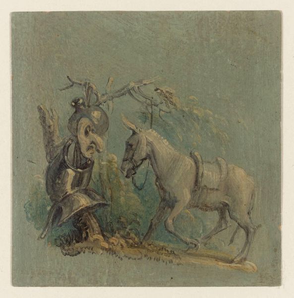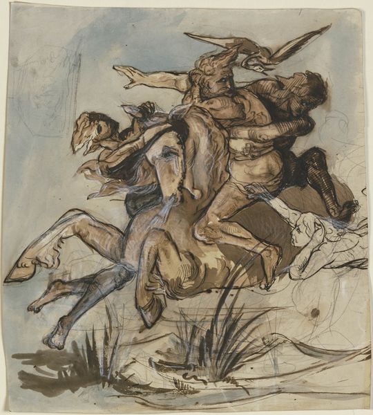 Curator: Here we have a watercolor drawing on paper titled "Genevieve" attributed to Rudolf Friedrich August Henneberg. It’s currently housed here at the Städel Museum. Editor: My first impression is of a frenetic energy barely contained within the gentle medium of watercolor. The whole scene feels unsettled. Curator: Yes, there is a palpable tension. The image portrays a dramatic rescue, drawing upon a specific narrative framework, perhaps a literary one. Consider the gendered dynamics in play here. A woman is in distress, a man intervenes on horseback... how do we unpack those power dynamics in the 19th century? Editor: The horse rearing like that is central to its symbolism, it always suggests virility and dominance. Look too, at how fair-skinned the woman and the horse are compared to the man and his steed. I can't help but interpret her paleness and the lightness of the stallion as indicators of purity. And what does it tell us that her dress shares its color with the skies and horizon? It is as if the drawing connects this protagonist to nature's most untouched, pristine elements. Curator: That’s an interesting reading, given the socio-political implications inherent in that idealization of womanhood. There’s an undeniable emphasis on feminine vulnerability being framed as delicate or “pure,” setting up a problematic dynamic. Is Henneberg commenting on this or perpetuating it? It is interesting that he refrains from explicitly framing Genevieve as “white,” thereby avoiding those implications... Or is he? Editor: Regardless of Henneberg’s conscious intent, his imagery certainly partakes in a visual tradition that perpetuates a series of symbolic shorthands. This extends to the animals, too: observe the protective posture of one dog while a fawn or baby deer frolics by, so vulnerable... Curator: Right, there are these cascading tiers of dependence and vulnerability that ripple outward from Genevieve herself, underlining the urgent need for intervention—and reinforcing a specific construction of male heroism. Editor: It shows us how visual culture reinforces those symbolic structures even when we are unaware, the visual tradition that grants symbols like the rearing steed such strong emotional weight over centuries and various cultural contexts. Curator: Analyzing this artwork really clarifies how art objects participate in larger societal narratives about gender, power, and agency, whether intentionally or not. Editor: For me, considering the symbolic density of what could simply be a historical snapshot reveals enduring ways of thinking about vulnerability and rescue.