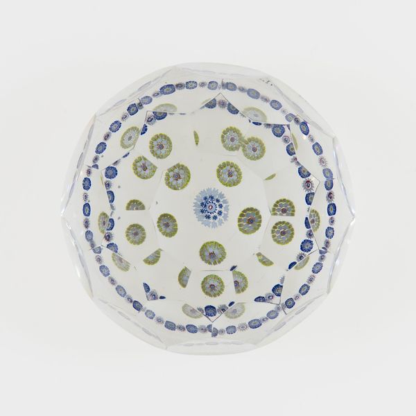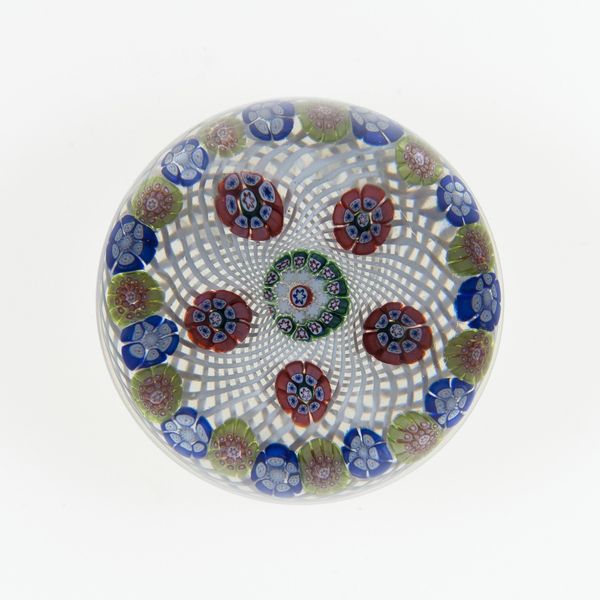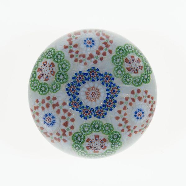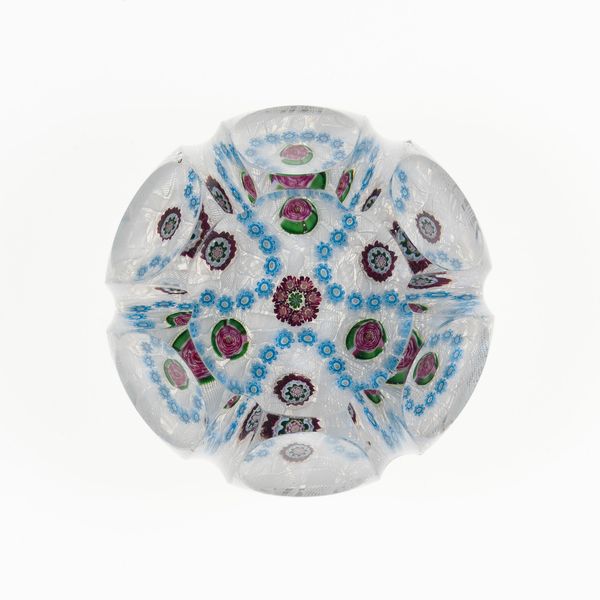 This paperweight was made by the Baccarat Glassworks in France, using glass. Consider this paperweight as an object embodying the opulence of the 19th century, a period marked by industrial advancement and intricate displays of craftsmanship. The millefiori patterns encased within, these 'thousand flowers' of glass, reflect a cultural fascination with detail and precision. France's Baccarat Glassworks became known for their luxury glass items. Institutions like theirs shaped artistic production, catering to elite tastes while also impacting the wider decorative arts market. The paperweight is both a functional object and a statement of status, a symbol of the period's embrace of luxury as an expression of social standing. To delve deeper, one might explore archival records of Baccarat, tracing the evolution of their designs and the social networks that sustained their success. This approach highlights how art is interwoven with the social and economic conditions of its time, and shows us that it is through careful research that we unlock the fuller story of works such as this.