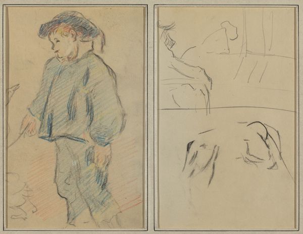Editor: Here we have "Three Studies of a Pig; Breton Boy Walking with a Jug", made between 1884 and 1888 by Paul Gauguin, using pencil and watercolor. It looks almost like two separate sketches put together. On the left, quick pencil studies of a pig, and on the right, a more developed, slightly colored sketch of a boy. What stands out to you in this piece? Curator: What arrests me immediately is the diptych structure. The contrast between the almost purely linear, economic sketches on the left and the more tonal, color-inflected figure on the right is striking. Gauguin forces a formal juxtaposition of line and volume. Consider how the pig studies exploit negative space to define form, a classical drawing technique, versus the layered, atmospheric handling of watercolor around the boy. Editor: So, you're drawn to the *how* it's made, more than *what* it's showing? I find the pig studies a bit simple, like casual doodles. Curator: Not entirely. Observe how even in those 'doodles,' the single, continuous line describing the pig's back dictates the creature’s weight and posture. Similarly, notice the strategic hatching around the Breton boy which creates an optical mixture, suggesting not just light and shadow but also texture in his clothing. Where does Gauguin let the paper show through? Where does he build up the color? These decisions inform our reading as much as, or perhaps even more than, the subject itself. Editor: That makes sense. I can see how the negative space and the different rendering techniques are key compositional choices. I’ll definitely pay more attention to those techniques next time. Thanks! Curator: Indeed. Focusing on the "how" allows us to enter into a richer understanding of the artist’s thought process, transforming seeming simplicity into considered complexity.