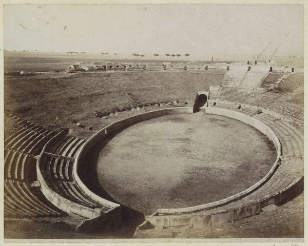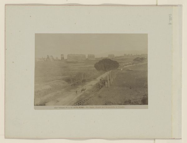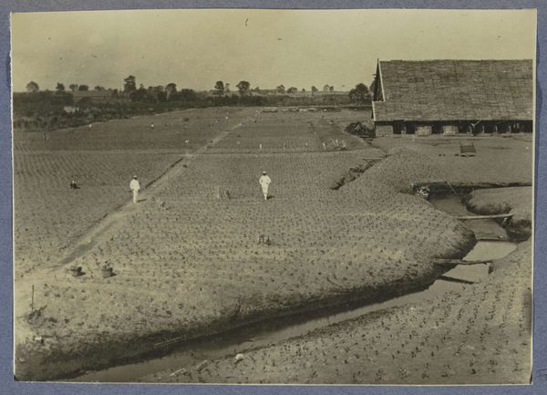 Editor: Today, we're looking at "Uitzicht met witte bank," or "View with White Bench," a photograph by E. ten Cate, likely taken between 1908 and 1914. It's a fairly subdued landscape, quite soft and dreamlike. The composition is simple, a white bench anchoring the foreground, leading the eye to a distant horizon. As you examine the landscape of the picture, what do you notice? Curator: Formally, I am immediately drawn to the use of the stereoscopic image to emphasize depth. We observe a clear structure, from the tactile surface implied by the ground in the immediate foreground, leading back to the hazy horizon line. Notice the placement of the bench – it is not merely an object but a compositional tool, creating a visual pathway. This arrangement functions as an ordering principle in the photograph, leading to visual stratification. Editor: Yes, the bench really frames the view. And that softness, would that have been intentional or is that just how photography was at the time? Curator: That would be due to Pictorialism, an aesthetic movement in photography which flourished during that time, emphasizing artistic effect through soft focus, special filters and printing techniques to mimic the appearance of paintings or etchings. Observe, as well, the limited tonal range and sepia tone. These elements work to detach the image from stark realism. What is created in the process is an intentional atmosphere over verisimilitude. Editor: So, the artist is choosing mood over clarity. Is that accurate? Curator: Precisely. Ten Cate isn't simply recording a scene; the artist is manipulating the medium to evoke a particular sensory encounter. Editor: I never thought about photography in terms of “sensory encounters." It enriches how I look at things. Curator: And that sensory awareness informs all aesthetic appreciation. I appreciate how close visual analyses like this gives a new context.