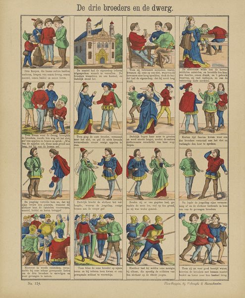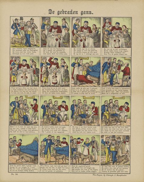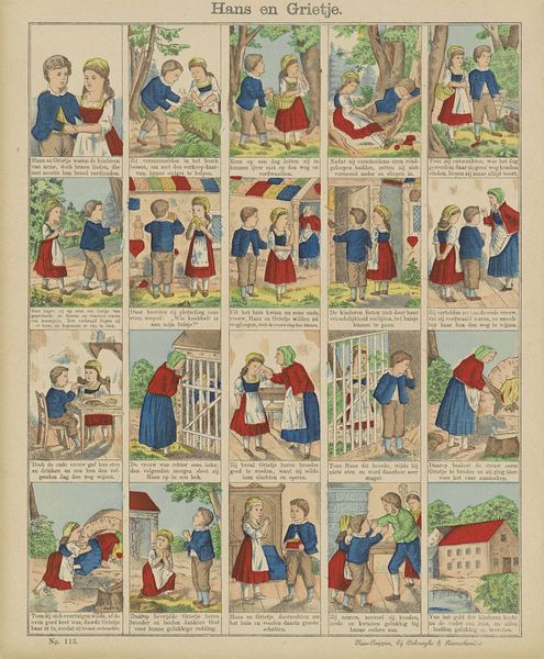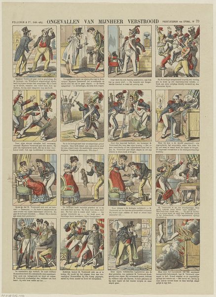 Editor: Here we have "Genezen vrees" by Oehmigke & Riemschnieder, a lithograph print from around 1828 to 1937. It's presented like a page from a children’s book or comic. It's cheerful but also has these unsettling images… what strikes you about it? Curator: Well, looking through a critical lens, it’s hard not to consider the context of the late 19th and early 20th centuries. These genre paintings, often aimed at children, can reveal much about societal anxieties and the transmission of values. Consider the imagery of fear, of discipline, of childhood innocence seemingly constantly under threat. Editor: So, you see the folk art style and relate it to childhood anxieties from the period? Curator: Precisely. Who is in power, who lacks it? Who is threatened by what? Even the aesthetic choice to arrange the lithograph like a sequential narrative subtly instructs how stories should be interpreted, guiding morality. The presence of both control and anxiety points to a particular construction of childhood. What messages do you think this layout might convey? Editor: It does seem a bit like 'be good, or else,' which might reveal a very controlling parenting style during that time. Maybe adults feared children being corrupted? Curator: Exactly. These kinds of works, ostensibly innocent, can be incredibly powerful tools in shaping ideology and dictating behavior, consciously or unconsciously teaching us how we should be. Thanks for pointing out the unsettling mood, this reading exposes the relationship between power and fear.