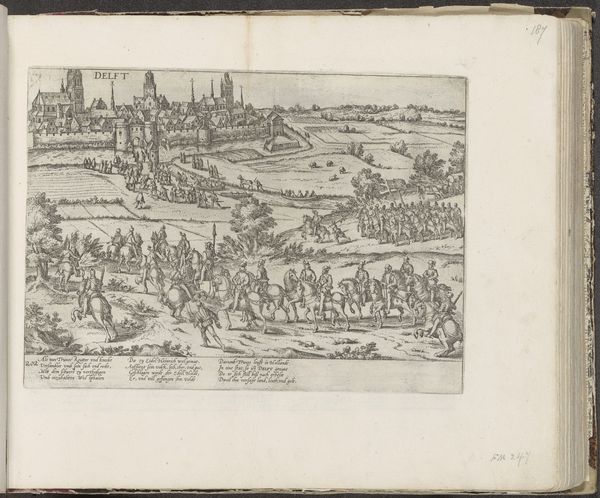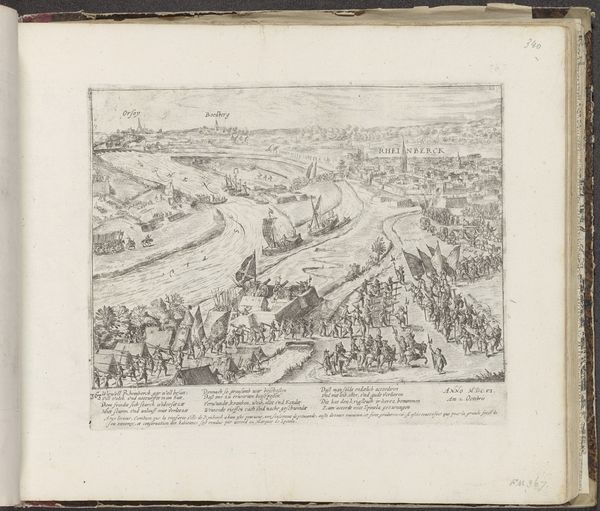 This is Frans Hogenberg's engraving, "Slag bij Borgerhout, 1579". Notice how the landscape is meticulously divided into horizontal bands. This design lends itself to narrative clarity as it unfolds from the immediate foreground to the distant horizon, almost like the panels of a comic strip. The stark contrast between the intricate details of the battle and the serene backdrop creates a tension. It causes us to consider the relationship between the specific event and broader historical landscape. Hogenberg employs a dense network of lines to articulate every figure and object. It also imbues the scene with a frenetic energy. This print uses the semiotic language of its time to convey not just the events of a battle, but also the complex political and social structures at play. The act of viewing this piece becomes an exercise in decoding visual signs. It is a study in the use of spatial organization as a means of structuring meaning and historical narrative.