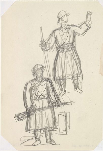 Curator: This drawing, “Running Prince with Matchlock, Accompanied by Two Attendants,” is an anonymous work, currently held at the Harvard Art Museums. It's rendered in pen and ink on paper. Editor: It feels so immediate, raw even, like a glimpse into a story unfolding. The sketched lines give the figures a sense of dynamic movement, don't they? Curator: Absolutely, this dynamism is key. The artist uses overlapping lines to convey the prince’s motion, a technique that also reflects conventions in Indian painting regarding the layering of forms to depict depth and space. It's fascinating how the matchlock, a symbol of power, is both functional and symbolic here. Editor: Right, the matchlock projects authority, but the unfinished quality creates a sense of vulnerability, as if the assertion of dominance is still in process. It offers a fresh perspective into how status and selfhood are defined within historical Indian art. Curator: It shows that image-making is a complex negotiation between self-presentation and external forces. Editor: It's more than just a portrait; it's a historical statement.