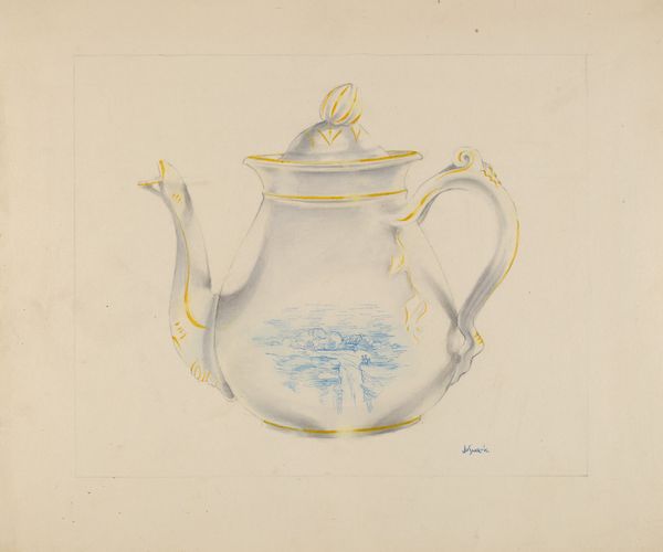 Curator: Look at this delightful watercolour, titled "Pitcher," created by Roberta Spicer around 1940. Editor: It has a sort of quaint elegance to it, doesn't it? Almost like a memory of a porcelain piece rather than a direct portrayal. The colors are soft, and the little wreath design gives it a folksy touch. Curator: I agree. This drawing encapsulates an interesting moment in decorative arts, when artists often blurred the lines between craft, design, and fine art, democratizing artistic practice and bringing design into everyday life. Pieces such as this, often found within museums or instructional pamphlets, are important visual documents of what everyday people were supposed to cherish in their lives. Editor: I’m drawn to the symbolism Spicer employed here. The garland is, of course, redolent of celebrations and home comforts, though the ribbon tied to its bottom in blue is unique, don't you think? This touch infuses what could've been simply a commonplace depiction with a certain intimate grace. The application of watercolour helps emphasize the beauty found in routine things. Curator: Definitely. The use of watercolors, even to represent something as materially robust as ceramics, can suggest something. What comes to your mind? Editor: Well, watercolors have always evoked a certain ephemeral quality to me; like the golden designs around it. So there is a play on fleeting and solid; like memories, like home comforts that remain with us regardless. The wreath design is such an immediately understandable image. And again, that little blue bow! Such a tiny pop of colour amidst the otherwise muted palette. Curator: Exactly. Roberta Spicer certainly left a charming visual document of a time when even household objects aspired to artistic expression and also it reflects a movement of using the tools of "fine arts" like painting to make fine artworks out of daily scenes of common objects. Editor: It is truly remarkable how even something as humble as a pitcher painted with watercolors, such an accessible and simple artistic approach can reveal so much about cultural values, individual expression, and lasting symbolism.