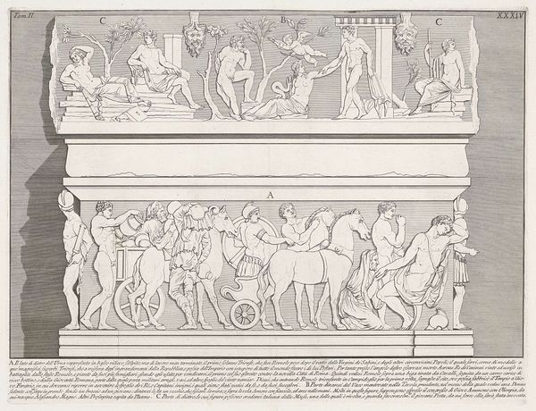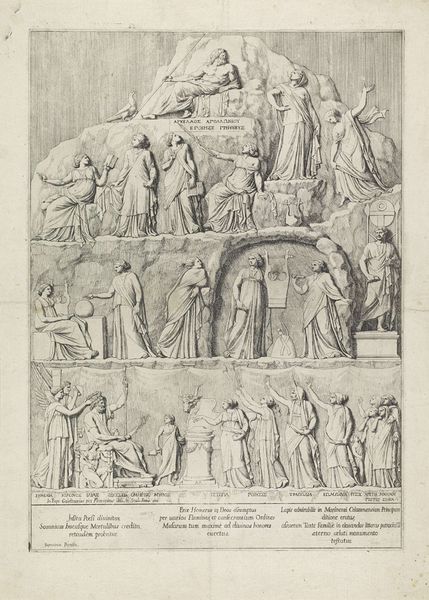 Editor: This is "Sacrifices to the Lares, after the Antique" by Henri-Guillaume Chatillon. It's a drawing, and I'm struck by how its composition mimics a classical relief. What can you tell me about its formal qualities? Curator: Observe how Chatillon employs line and tone to simulate the depth and texture of a stone carving. Note the careful delineation of figures and animals, creating a frieze-like arrangement within the rectangular format. The implied volume and weight contribute to its monumentality. Editor: So, the artist is intentionally trying to evoke a sense of classical sculpture through drawing techniques? Curator: Precisely. The medium is less important than the artist’s manipulation of it to suggest permanence and historical weight. Consider how the limited tonal range focuses attention on form and spatial relationships. Editor: I see, it’s all about how the artist uses the visual language of sculpture in a two-dimensional medium. That's fascinating. Curator: Indeed. Chatillon prompts us to consider how artistic forms and conventions transcend specific materials.