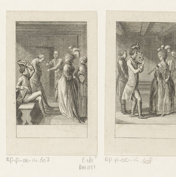 Curator: Right now we're standing in front of Daniel Nikolaus Chodowiecki's 1786 engraving, "Gesprek tussen de jager, pastoor en Schulze," housed right here in the Rijksmuseum. Editor: Immediately, I'm drawn to the tight, almost claustrophobic feel of the composition. It's like eavesdropping on a very hushed, serious affair, isn’t it? So many lines create such texture... Curator: Absolutely! It captures a real sense of the baroque aesthetic, meticulous and detailed, while also acting as a portrait. The process behind prints such as these feels almost industrial. To capture this level of detail, one must become one with their instruments. Editor: You’re so right. It's about how stories are disseminated, and this almost mass-produced aesthetic gives it so much texture, in the thematic and literal sense. I can feel that. It makes me wonder about the roles of these figures - hunter, pastor, and magistrate - a snapshot of 18th-century Prussian life, perhaps with a dash of social critique. Curator: The "genre painting" theme feels strongest to me here. These aren’t allegorical heroes, or elevated leaders, or mythical gods, but the pastor and hunter, everyday folks with mud on their boots and sweat on their brows, trying to navigate an exchange of ideas or a deal. The engraving serves almost as an illustration for a larger tale, prompting us to create a narrative from the figures alone. It could come straight out of a story, don’t you think? Editor: Yes! I imagine Chodowiecki wanted the viewer to focus not only on these key players and what the setting tells us but to remember these engravings were circulated among society to illustrate the important people of everyday life. I do like pondering on this. Curator: Thinking about its place amongst the various forms of media back then opens up interesting questions. You could view this through the lens of mass-reproducibility, or simply view it as a charming illustration of social interactions in old Europe. But what strikes me most of all, still, is its humanity. Editor: I feel such calm curiosity from looking at the art. Curator: I wholeheartedly agree. Thank you for that interesting materialist interpretation.
