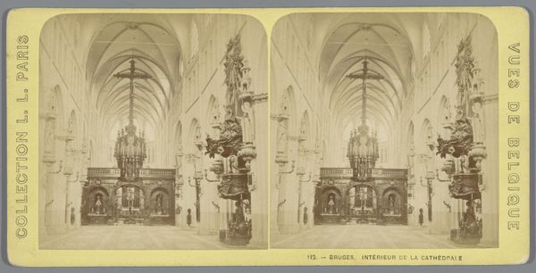 Curator: My first impression? Ghosts, whispering through the arches, lit by faded light. Editor: Yes, it certainly possesses that evocative quality. We're looking at Jules Hippolyte Quéval’s “Interieur van de Sint-Michiels-en-Sint-Goedelekathedraal,” taken between 1866 and 1870. It’s a gelatin silver print capturing the interior of the Cathedral of St. Michael and St. Gudula, and currently residing at the Rijksmuseum. Curator: The space feels so vast and yet incredibly still, doesn't it? Those rows and rows of chairs look deserted, almost expectant. There's something a bit mournful about it, despite the soaring Gothic architecture. Editor: Indeed. Quéval has masterfully used the long exposure times characteristic of early photography to emphasize the cathedral's grandeur, drawing attention to its architectural elements, particularly the soaring arches and ribbed vaults so indicative of the Gothic style. It's a formal, almost scientific, recording. Curator: Scientific, maybe... but for me, the emotion trumps everything. You can almost smell the incense, hear the distant echoes of a choir. I bet the light spilling through those stained-glass windows must have been dazzling. I wish the image could capture those colorful rays. Editor: Interestingly, the monochrome format highlights the structural design with the way the light falls across the columns and defines the arcades. Also note how this gelatin-silver print transforms what were typically medieval characteristics to an evocative urban cityscape of the period, creating something of a theme, no? Curator: Yes, I get that. This isn't just a record of bricks and mortar. Quéval invites us to reflect upon how time transforms holy places into quiet containers for human experience. What do you take away from viewing this composition, purely on a structural basis? Editor: Structurally, the symmetrical composition draws the eye deep into the cathedral's apse. The play of light and shadow across the surfaces underscores the inherent tension between the finite materiality of the structure and the infinite possibilities it suggests. And you? Curator: I feel as though I've spent a minute reflecting on what I can be grateful for in my daily life. It gives pause to life’s quieter moments and beckons me to appreciate everything in its stillness.