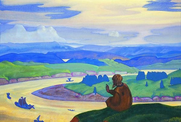 Curator: Let’s discuss Nicholas Roerich’s "Daughter of a Viking," painted in 1918 using oil paint. Editor: What strikes me is how the figure almost blends with the landscape. She seems connected to it, but I wonder how? What do you see in this piece from your perspective? Curator: I see a carefully constructed landscape built to evoke specific emotional and ideological responses. Notice how the application of the oil paint creates texture in the foreground hill but flattens in the ethereal, almost theatrical backdrop. Consider the economic factors driving artistic materials during wartime and Roerich’s choice to manipulate paint quality so drastically. It is the hand, and by extension, labor and social structures are encoded in this piece. Editor: That's interesting. So, you're saying the way he uses the material speaks to broader social circumstances, instead of artistic choices? Curator: Precisely! It is the interplay between intention, available materials, and artistic labour. Even her attire --it’s carefully crafted using specific techniques, signifying a certain class or role within her society. It's about labor, production, and consumption all embedded within the image itself. Roerich may have had an ideal in mind, but the limitations and the processes were important for how he realized the piece. Editor: So, beyond just seeing a figure in a landscape, you’re pointing out the story of how it was made and the world that shaped its making? Curator: Exactly. By understanding the process and materiality, we gain deeper insight into both the artwork and the cultural context it comes from. What did you gather from this artwork, Editor? Editor: Thanks! I learned to appreciate art through its connection with labor and materials, it reveals new ways of appreciation.
