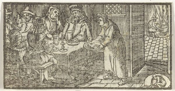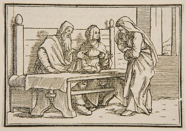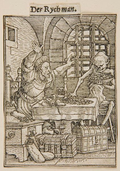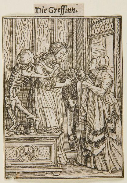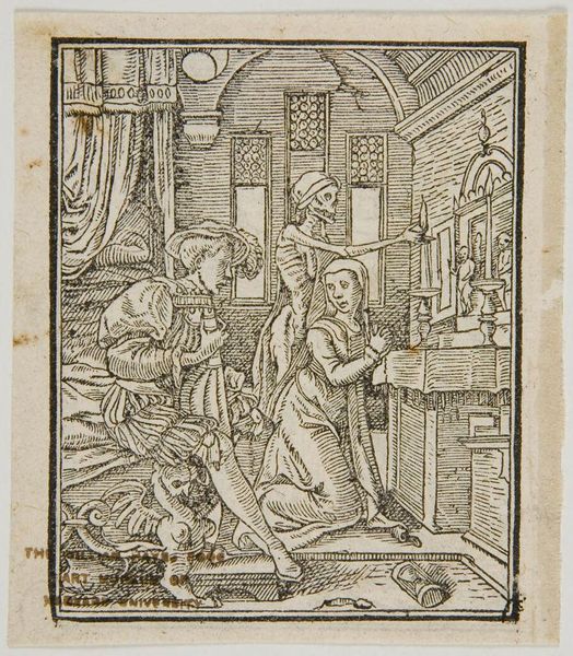 Curator: This is Hans Holbein the Younger's woodcut, "The Nun." Notice the skeletal figure juxtaposed with the praying nun. Editor: The density of lines! See how Holbein achieves such volume and texture, starkly contrasting the living with the macabre. Curator: It certainly speaks to the role of the church and gender dynamics in the face of death during the Reformation. The nun's devotion contrasts with Death's intrusion, reflecting societal anxieties. Editor: The composition directs our gaze to the center, heightening the drama. The lines create a sense of tension. Curator: Right, it's a powerful critique about the church's impact on women's choices, especially concerning monastic life. Editor: The visual language is compelling. It has a lasting impact. Curator: It does. It invites us to consider the historical forces that shape individuals' lives.