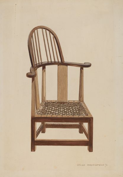 Curator: So simple, yet elegant! We're looking at "Heart and Crown Chair," a watercolor on paper, dating from about 1936, by Howard Weld. Editor: It feels so delicate, like a memory. The chair itself, represented in watercolor, carries such an evocative mood with those soft browns. It almost feels like a gentle domestic yearning, doesn’t it? Curator: Absolutely. Let’s think about this practically: Weld documented this object in detail. The rungs, spindles, woven seat... all carefully rendered. What kind of labor went into producing this chair, originally? Was it a factory production or artisan craftsmanship? These objects embody entire social systems, don’t you think? Editor: Indeed. A chair like this invites considerations of social class and lived experience in a way that is deeply relatable. And what did it *mean* to have such an item during the 1930s? I can't help but consider the narrative this watercolor speaks of everyday resilience. A simple, useful object elevated through art, prompting considerations around gender roles, craft traditions, the symbolism of the 'heart and crown' motif in a postcolonial context and, in a way, democratising aesthetic values. Curator: The heart and crown—it's functional, yes, but there’s also a yearning toward more embellished designs that were then emerging during the early to mid-twentieth century. How were ideas about beauty and domesticity being circulated during that period? Was Weld interrogating how these forms shaped values? It really encourages us to engage in a discussion about design and society! Editor: Certainly! But beyond design, think of the hand that made it and the bodies that sat in it. The history imbued is not just in material creation and usage but a deeper connection between personal lives and the social fabric itself. It's about connecting materiality with the intangible. Curator: It is incredible how this relatively unassuming object has these multilayered relationships with material culture and social context. We start looking at a simple chair and find our perspective shifting radically! Editor: Exactly! A simple chair; but when approached critically through material processes and embedded in society at large, reveals hidden dialogues we rarely discuss.