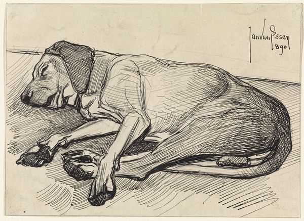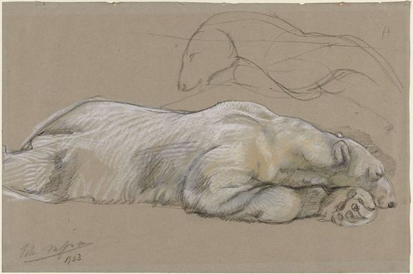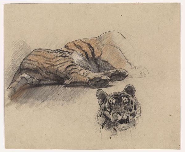 Editor: Here we have William Strutt's "A Lioness Preparing to Spring," created around 1889, employing charcoal, pencil, and watercolor. The image feels quiet, almost contemplative, despite the latent power of the subject. What elements of the composition stand out to you? Curator: The artist's control of line and tone is evident. Note how Strutt uses the interplay between the graphite and watercolor to build a sculptural form of the lioness. The anatomical structure is well observed, a key concern within academic art practices. What is more arresting is the negative space around the animal. Editor: Yes, it is like there are multiple sketches overlaid. The lioness is the only truly rendered subject. Curator: Precisely! The effect creates a dynamic tension. It almost suggests that the idea, the _concept_ of the lioness, is what's of interest, rather than the physical representation. The preparatory sketches serve less as background than as explorations of form, which never coalesce into a finished piece. Editor: So it’s less about a lioness, specifically, and more about how its shape is rendered? Curator: In essence. Consider, too, the strategic use of line weight and shading. Strutt draws the eye to specific areas like the face and paws to underscore an emphasis on realism, yet contrasts these parts with other, hazier renderings. This strategic ambiguity and its artful balance makes this a powerful piece. It has shifted our understanding hasn't it? Editor: Definitely. It started out representational, and now I am seeing the underlying structure. Thanks for sharing this viewpoint.