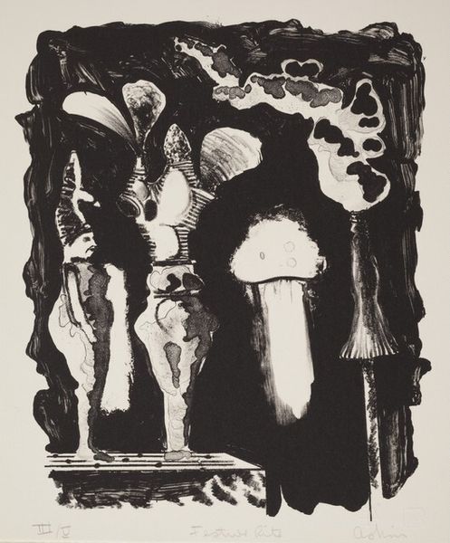 Louis Bunce made this untitled print using lithography, embracing the magic that can happen when you surrender control to the process. The composition is bold, almost confrontational, with its stark black and white palette. The lithographic crayon must have been applied with real gusto to create this dense network of marks. Look at the textural variety; areas of solid, velvety black contrast with delicate, scratchy lines. It’s a real push and pull between light and dark, absence and presence. Notice the way Bunce allows certain forms to emerge and then dissolve back into the background. The areas of frenetic mark making create a vibrating energy, and there’s a definite nod to artists like Franz Kline, who similarly embraced the power of gesture and the beauty of imperfection. Bunce’s print is a reminder that art is not about perfection but about exploration and the joy of discovery.