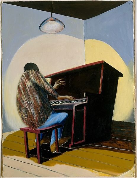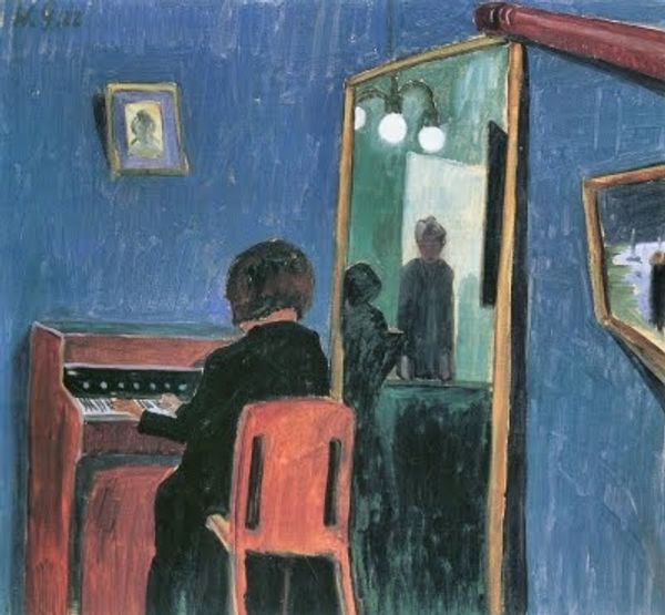 Constantin Piliuta’s painting, titled 1907, presents a man playing a piano in a room of disarray through crude lines and contrasting colours. This work is an exploration of form and meaning, rather than a replication of reality. The scene is dominated by blocks of colour, where the man with his yellow skin stands out against the vivid blues of the wall and rug. These colour contrasts create a sense of unease, compounded by the artist's deliberate use of rough, uneven lines. Note the odd inclusion of an axe atop the piano. Here, the artist seems to destabilize traditional notions of harmony and order. This discordant visual language disrupts conventional perspectives and invites us to question fixed interpretations. Piliuta does not offer easy answers, but rather, through his unique formal approach, creates a space for ongoing dialogue between the artwork and its viewer, urging us to reconsider our own perspectives.