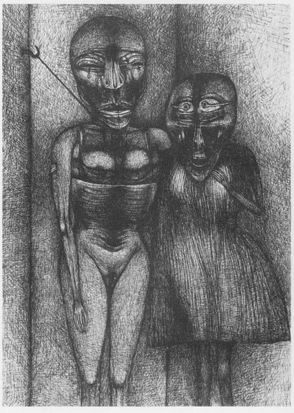 Curator: Here we have Pablo Picasso’s 1906 charcoal drawing, "Seated nude and standing nude," currently residing here at the Philadelphia Museum of Art. Editor: My immediate impression is one of somber unease. The raw, almost primitive quality of the charcoal seems to amplify the figures’ stark vulnerability. Curator: Indeed. This work marks a crucial juncture in Picasso’s artistic evolution, a move away from the more sentimental tones of his Rose Period towards the angular, fragmented forms that would later define Cubism. Look at how the artist uses dense hatching to define the volumes and shadows. Editor: Yes, it's almost as though the bodies are being built up through a laborious process. The texture itself speaks of time and the sheer physical effort involved in producing the work. You can almost feel the artist wrestling with the material, the charcoal resisting the form he is trying to create. This challenges notions of effortless artistic genius, presenting a gritty, human reality instead. Curator: Absolutely. Notice the expressive distortion of the figures, especially the seated nude. Her gaze, those large eyes, evokes a sense of introspection. We see not idealized beauty, but a complex representation of the human form, infused with psychological depth. The contrast with the more erect posture of the other nude creates a compelling dialogue, doesn't it? Editor: It does. The almost oppressive application of charcoal lends to the figures a weight, a groundedness that challenges classical notions of the nude as simply an object of visual pleasure. The choice of this coarse medium underscores the corporeality, the physical existence, of these women in a powerful way. One wonders about their socio-economic positioning, perhaps workers? Curator: A possible reading, yes. It’s through this focus on form, and the challenging of traditional perspectives, that Picasso forges a new visual language. Editor: Ultimately, it’s about the transformation of simple materials through labour and imagination. It certainly invites us to question established conventions and reconsider our perspectives on beauty, labor, and the raw process of creation. Curator: Agreed, the beauty exists, in a non-conventional and complex way. A testament to the transformative power of line and form in evoking emotion.