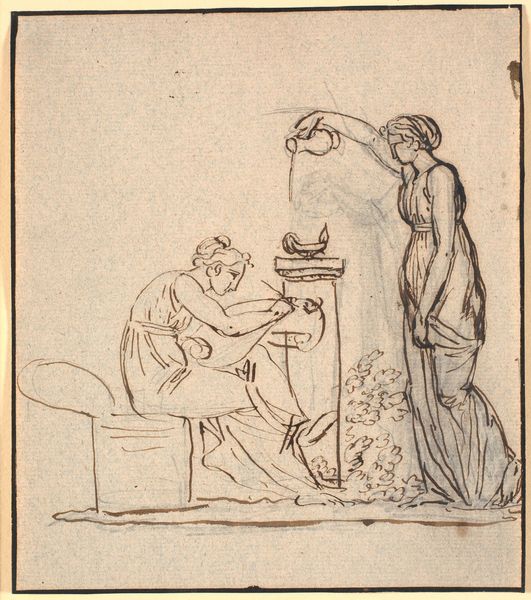 Editor: This is a pencil drawing by Nicolai Abildgaard called "To figurer," dating from around 1743 to 1809. The delicate lines and classical subject matter give it a very formal, almost staged feeling. What can you tell me about its context? Curator: It's fascinating to consider this drawing within the historical context of Neoclassicism. How do you think the burgeoning museum culture of the late 18th and early 19th centuries, and its emphasis on the art of classical antiquity, influenced Abildgaard's artistic choices in "To figurer"? Editor: That’s a good point. The poses feel very deliberate and reminiscent of ancient Greek or Roman sculptures, a bit like a history painting on paper. Was Abildgaard commenting on a particular societal value of his time? Curator: Indeed. Neoclassicism often served as a visual language for conveying Enlightenment ideals of order, reason, and civic virtue, virtues valued after the French Revolution, although this artist was working pre-revolution. Consider how the public reception of such idealized figures would have served socio-political goals within the art world. Who do you imagine were the likely audience for artwork such as this, and in what kind of location might they have viewed this piece? Editor: I guess it would have been wealthy people who collected art and understood its political messaging. I never thought about pencil sketches being used to spread political messages! Curator: It highlights how artistic expression became intertwined with the construction of national identity and cultural values in the age of museums and increasing accessibility of the fine arts. Editor: I’ve certainly got a new perspective on how much politics are involved even in what feels like simple pencil drawing from long ago. Thanks for the insights.