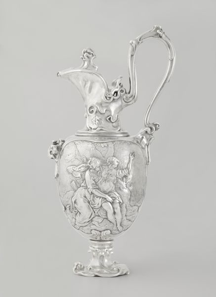 Curator: This lovely little jug is an example of 17th-century ceramic ware, currently residing at the Metropolitan Museum of Art. The piece features narrative imagery typical of the Baroque period. Editor: The soft curves, the simple shape – it all speaks of such understated elegance. But the palette is surprisingly subdued for the Baroque. Curator: True. We need to consider that decorative arts were a significant marker of status, often commissioned by the rising merchant class of the time to reflect their newfound wealth and sophistication. The subject matter suggests refined interests. Editor: See how the artisan masterfully used shades of gray to build depth and suggest light sources from multiple points. The detailing, particularly in the figural representations, is remarkable given the small scale. It’s fascinating to see how different elements intersect to generate rhythm and unity throughout the piece. Curator: It depicts an allegorical scene, echoing popular tropes of virtue, learning, and godly inspiration meant to educate its users. Think of the jug as an emblem of the social aspirations held by a particular class within society. Editor: I see, the ornate frames that seem to flow directly from the head of what looks like an angel, add to this circular and unifying dimension, enhancing the symmetry of the whole. Did any academic writing delve into how it achieves this level of dynamism in a confined area? Curator: There’s less scholarship on such a practical item, much is focused on the paintings of the time! Editor: Well, whether its purpose was quotidian or emblematic of virtue, I cannot stop looking at how gracefully proportioned all parts are—pure enchantment! Curator: It's certainly a tangible piece of social and cultural history. Editor: It is! I came away today from a journey through structure and visual elements. Thank you for bringing this to life for me, it now sparks my imagination beyond shape.