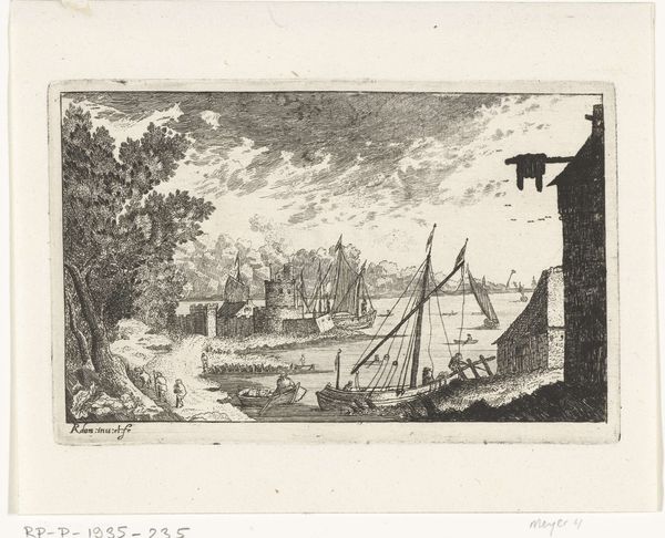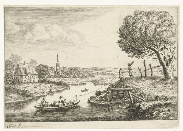 Editor: So, this is “Vaart met zeilboot,” or “Sailing Boat” by Jacob Cats, from 1763. It's an etching and print made of ink, currently residing here at the Rijksmuseum. It has such a calm, quiet sort of stillness to it, even with people in the scene. I'm drawn to how everything is neatly placed but feels casual. What stands out to you most about it? Curator: Well, for starters, it whispers of a time when life had a different rhythm. It invites a gentle daydream. The Dutch Golden Age wasn’t just about grand portraits; it was also about capturing the soul of the everyday. Notice how Cats uses a flurry of delicate lines to sketch the water and sky – like nature breathing right there on the page. Doesn’t it almost feel like a fleeting moment? A memory? Editor: Definitely, like a quick snapshot of a quiet day. I’m interested in how he decided what to include – why *this* particular cluster of houses and that little church spire way off in the distance. Curator: Exactly! He's not just documenting a scene. He's building a mood. The dark ink that gives solidity to some figures in the front brings them *forward,* while other distant, and faded forms create depth of place and time. The embracing children – or perhaps siblings – add to this dream of simpler times. Think of how, even today, we chase that serenity near water… the gentle lap against the hull of a boat is soothing, don’t you agree? This etching makes that serenity tangible, wouldn’t you say? Editor: It really does. Seeing all the little lives intertwined like this really personalizes what could have been just another landscape. Curator: Agreed! Art is not about passive observation, it’s an opportunity to get lost. Editor: I’ll try and remember to look for that "getting lost" element next time.