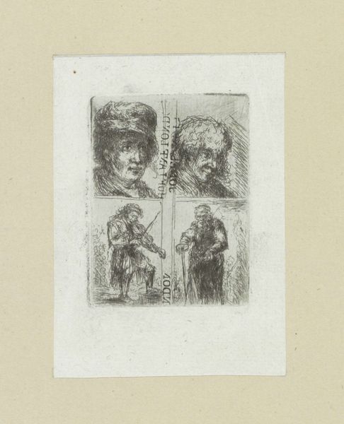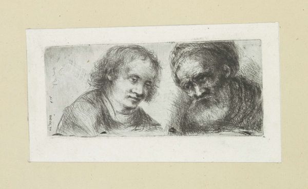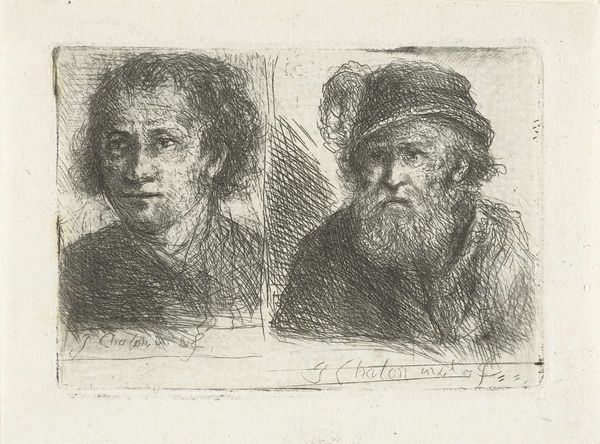 Jan Chalon created this print, "Two Men," in the late 18th century. The composition is divided vertically, presenting us with two distinct portraits, each rendered with a remarkable economy of line. On the left, we see a younger man, his features softer, framed by unruly curls. To the right, an older, bearded figure sports a cap, his face etched with the lines of time. Chalon's use of hatching and cross-hatching is particularly effective. It not only defines form but also creates a palpable sense of texture, from the rough fabric of the cap to the stubble of the beard. The division of the image invites a semiotic reading. Are these studies in contrast, youth versus age? Or is Chalon exploring the dichotomy of human experience through physiognomy? Ultimately, the print's power lies in its formal qualities. It uses simple lines to evoke complex narratives about identity and existence. It leaves us to ponder the stories etched into each face.