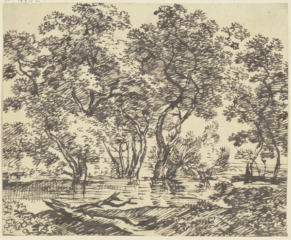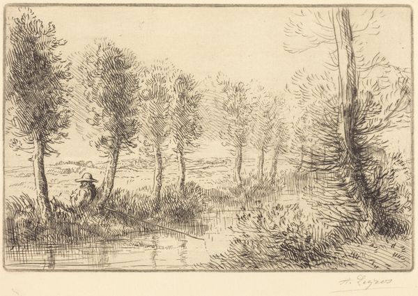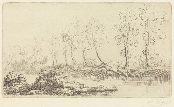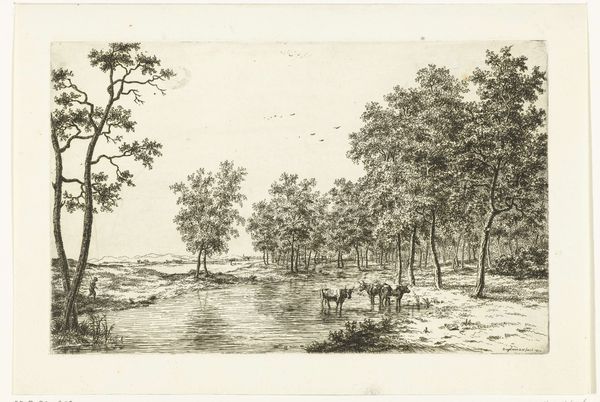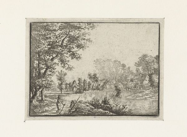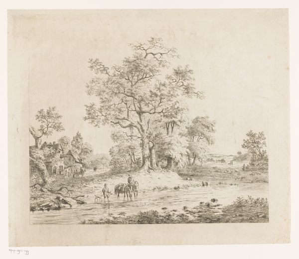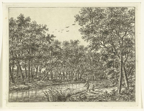 Ernst Willem Jan Bagelaar created this river landscape with trees and a fisherman using etching techniques. The artwork presents a serene scene, connecting to the romantic idealization of nature prevalent in the late 18th and early 19th centuries. The composition is built around a contrast between the natural elements, such as trees and water, and a human presence in the form of the fisherman. Made in the Netherlands, this print reflects the cultural appreciation for landscapes, a tradition going back to the Dutch Golden Age. It's interesting to consider the social conditions that shaped Bagelaar's artistic production. The rise of a middle class with disposable income created a market for art that celebrated the beauty of the natural world. To understand the historical context of Bagelaar's work, scholars can turn to period writings on art and aesthetics, sales records, and biographies of the artist. Ultimately, understanding the art is based on the social and institutional contexts in which it was made.