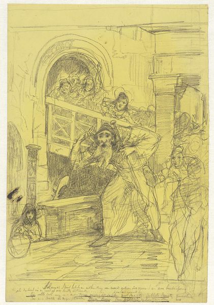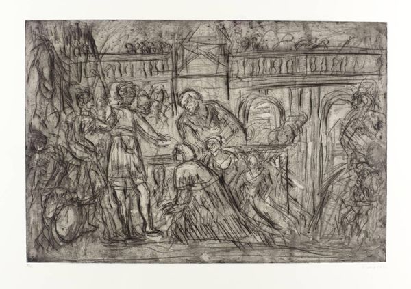 Luc-Olivier Merson's "Projet d'illustration pour Macbeth- apparition du spectre à Macbeth" is a drawing rendered in ink and wash, evoking a scene of ghostly visitation. The composition is a swirl of layered figures, where the solid and spectral blur the boundaries of reality. The use of monochromatic washes creates a subdued palette, enhancing the otherworldly atmosphere and emotional weight of the scene. Merson uses line and shadow to define the psychological tension, and plays with light and dark to create visual drama. The deliberate ambiguity challenges the viewer to discern the real from the imagined, and suggests the destabilized mental state of Macbeth. The formal construction invites us to consider the semiotic system at play. The ghost acts as a signifier of Macbeth's guilt, while the stark composition embodies the disintegration of his moral and mental landscape. It is this formal complexity that positions the artwork within broader discussions about perception, guilt, and the breakdown of order.