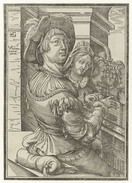 Editor: This is *The Martyrdom of Saint Barbara*, an engraving by Master ES, around 1450. It feels surprisingly delicate, given the subject matter. I mean, there’s so much detail in the drapery and the angel in the top right. What strikes you most about this piece? Curator: You know, it’s funny, death and delicacy aren't usually happy bedfellows! For me, it’s that intense stillness right before, well, everything changes. The air crackles, doesn't it? Saint Barbara’s calm amidst chaos, her executioner looming... It speaks to an inner strength, a quiet rebellion against the patriarchal structures of the time, which must have felt intensely subversive then. Editor: The tower behind her... that’s clearly symbolic, right? Is that what gives her the strength? Curator: Exactly! It's her refuge, her space of contemplation. Imagine locking yourself away, just you and your beliefs. It’s defiance rendered in stone. What's fascinating is how Master ES uses the fine lines of engraving to create depth. You can almost feel the rough texture of the tower wall, yet the angel seems ethereal. Editor: So the stark contrast isn’t just technical; it emphasizes the spiritual dimension, this quiet resilience against violence? It's like a secret whispered amidst a shout. Curator: Precisely! Art often functions that way, doesn't it? Like a code to unlock hidden emotions. Next time you encounter turmoil, perhaps visualize Barbara, grounded in faith, unwavering. Editor: Definitely. The details in this print, so subtle yet powerful, makes even such an early work unexpectedly potent. Curator: Yes. This engraving’s reminder that faith can indeed be our strongest tower, even when it faces an end like this one, is a lesson still ringing clear through centuries.