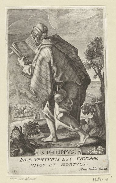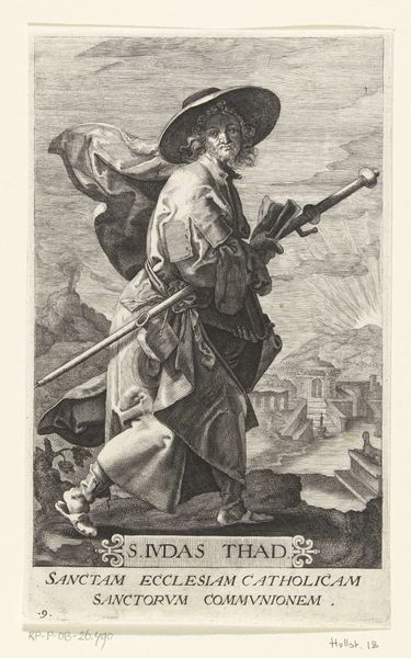 This is Johan Barra’s etching of Apostel Mattias, made sometime between 1591 and 1634. The composition draws you in with the Apostle's figure, set against a landscape rendered with precise lines. Notice how Barra employs hatching and cross-hatching to sculpt forms and evoke textures, a technique that adds depth to the primarily monochrome image. The apostle is not just a figure but a study in contrasts—his soft drapery against the rugged, natural environment. The books on his back and the halberd in his hand aren't just props; they're signs. They hint at Matthias’s spiritual conviction and the assertion of religious authority. Barra’s strategic use of line and form invites us to consider the convergence of the spiritual and the earthly, the personal and the institutional. How do the material qualities of the etching—its lines and textures—contribute to the overall meaning and reception? It prompts us to reconsider how symbols function within historical and artistic contexts.