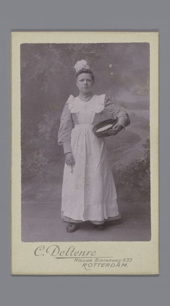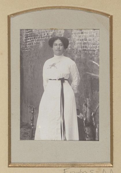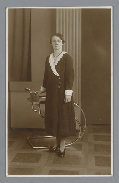 Editor: So, here we have a photograph – "Studioportret van een onbekende vrouw naast een stoel," or "Studio Portrait of an Unknown Woman Beside a Chair" – made sometime between 1923 and 1927. It's a striking image, but something about its straightforward realism feels…almost hauntingly simple. What captures your eye in this piece? Curator: Oh, that feeling of quiet simplicity hits me too. The realism offers itself like a secret whispered across time. What intrigues me are those blurred edges and soft focus. Notice how the background seems almost painted, fading away like a dream. Doesn’t that lack of precise detail shift this from a mere photograph into something more...emotional? Editor: It definitely adds a layer of depth. Almost as if we're meant to focus entirely on her. Curator: Exactly! She isn’t merely present; her very vagueness forces us to fill in the blanks. What stories do *you* imagine for her? What does she tell you without actually uttering a word? Editor: Well, I see a certain…seriousness. But maybe that's just the style of the time. I wonder, did the photographer, Mordecai Dudkin, know her, or was this a completely anonymous sitter? That unknown element makes you want to create a narrative. Curator: Isn't it wonderful how a single, carefully composed image can hold so many potential narratives? The chair almost looks like a silent companion; its presence suggests both stillness and perhaps, the expectation of movement, of someone joining her. Consider, what stories did *ordinary* women from this period embody? Dudkin gifts us the unvarnished poetry of her quiet existence. It gives us a little peephole into someone else's universe, one picture at a time. Editor: I never thought about it that way. It is like unlocking a hidden narrative from the past, from someone we'll never meet! I am off to research the fashion and culture of this time to put her in a wider context. Thank you! Curator: My pleasure. Perhaps, every piece of art beckons us into dialogue—not only with itself, but also with the unseen artist, the forgotten sitter, and ultimately, with ourselves.