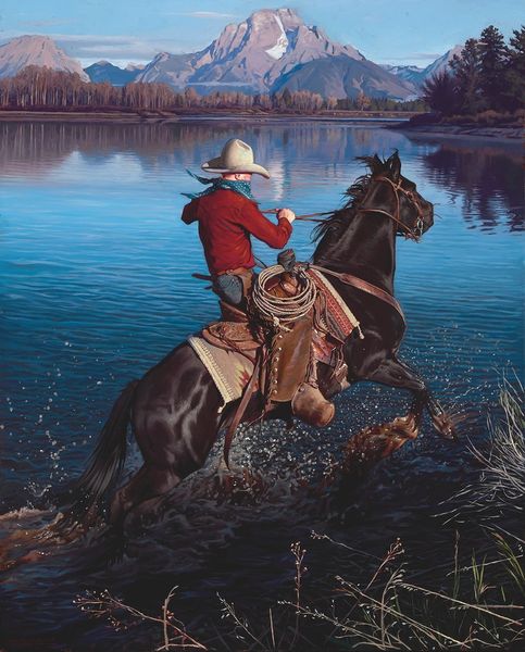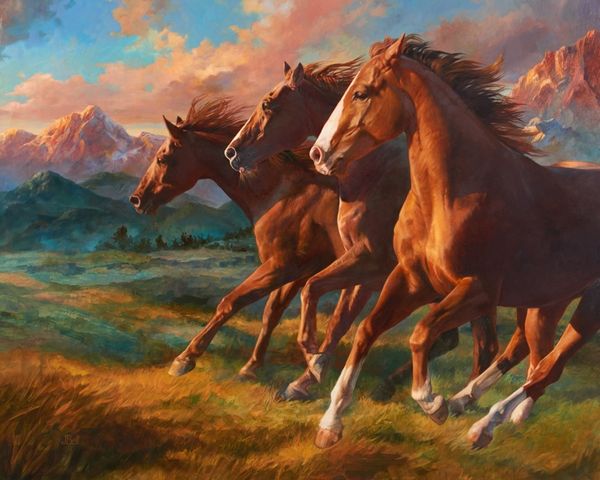 Mark Maggiori made this painting of the unexpected wreck, and it's a scene that's all about movement, painted with a real sense of action, the brushstrokes almost mimicking the frantic energy of the moment. Look at how Maggiori uses the paint, the way it's thick in some places, giving real texture to the horses' manes and the dust they're kicking up, then thin in others, almost transparent, especially in the distant mountains. It’s like he's not just painting what he sees, but also the feeling of being there, in that dusty, chaotic moment. I’m drawn to the way the painter captures light, look at how it hits the white horse. This piece echoes the old masters of the American West, but with a modern sensibility. It's a conversation across time, with artists like Frederic Remington or Charles Marion Russell. It embraces the ambiguity of the West. It's all about the interpretation of a landscape, a lifestyle, and a moment in time.