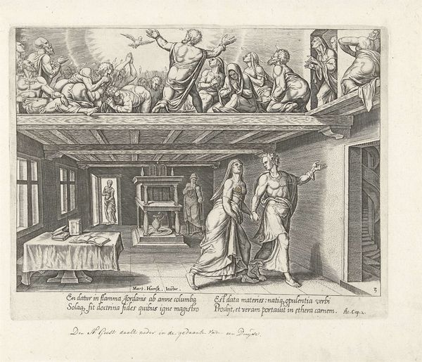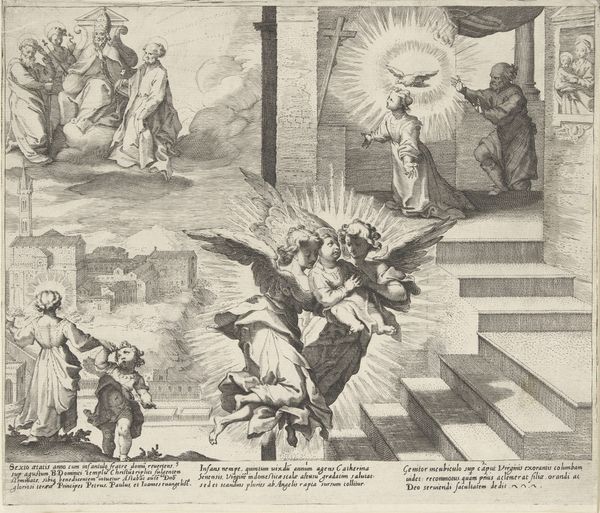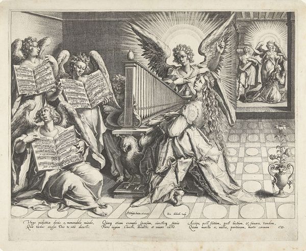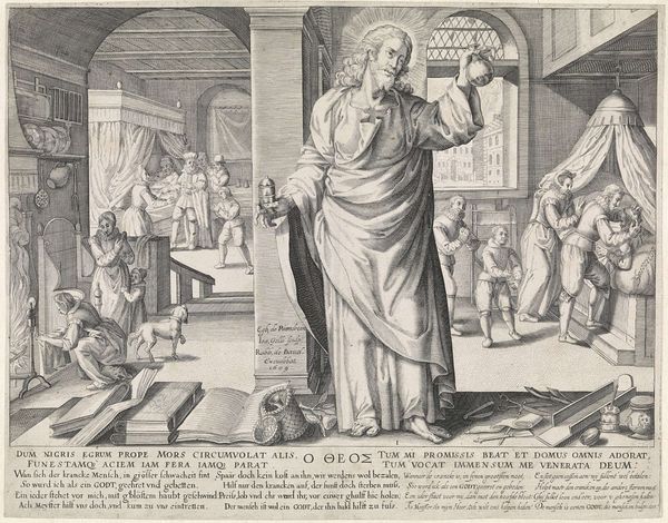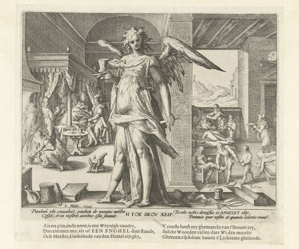 This engraving titled "De geneesheer als engel" or "The doctor as angel" was made around 1600 by Johann Gelle. It seems to respond to a period of cultural and religious transition in the Netherlands, in which the roles of faith and medicine were being renegotiated. Look at the way the artist interweaves the earthly and divine realms: a doctor tends to a patient indoors, while a large, androgynous angel is looking down over the scene. The angel may be seen as a comforting symbol of divine intervention at a time of uncertainty. This image also raises questions about the social status of the artist at that time. Was Gelle's representation of doctors as angels an attempt to elevate their social standing, or to highlight their importance within a changing society? To understand this image better, we can consult historical texts, medical manuals, and religious pamphlets from the period. Examining the cultural context in which art is made is key to understanding its purpose and significance.