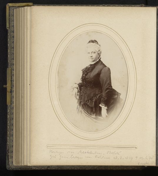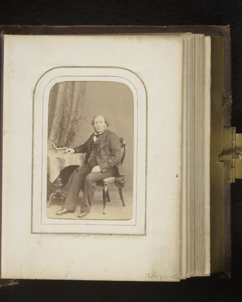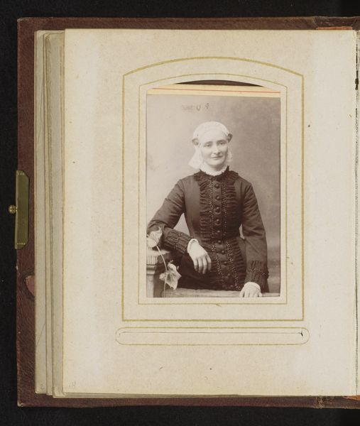 Curator: What a stern countenance. He projects such gravity. Editor: Indeed. We are looking at a mounted albumen print, titled "Portret van een staande man"—or "Portrait of a Standing Man"— created sometime between 1860 and 1900 by Perin & Schahl. This was the age of the burgeoning middle class using photography to signal status. Curator: You can see it, can't you? His erect posture, the neatly trimmed hair, even the subtle gleam of what appears to be a medal pinned to his coat. It is all part of the performance for posterity. Editor: Absolutely. That medal is a critical symbol here. Medals denoted valor and service. This photograph announces a very specific ambition: to present himself as an upstanding citizen. Notice, too, the hand resting formally on what appears to be a small table, another gesture towards respectability. It's a fascinating construction of bourgeois identity. Curator: Photography was still finding its feet then, wasn't it? This print seems so self-conscious, so deliberate. I am more intrigued by the role this image would have played at home and within society. Who was the sitter? What was his profession? Editor: Those are fantastic questions. I'm left wondering how successful he was at managing his image, since the print shows the man at a moment frozen in time and made into a powerful statement of achievement through material objects and dignified gestures. The details contribute so vividly to our understanding of his identity, but it could just be an ideal for who he wanted to be and not necessarily an authentic portrayal. Curator: Yes, this small framed albumen encapsulates how photography, then as now, constructs and solidifies roles. It’s an artifact, loaded with self-conscious aspirations. Editor: In the end, it’s still a fascinating peek into the values of that time and the subtle power of a portrait like this.