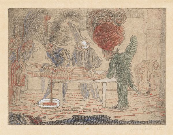 James Ensor made this etching, called 'Avarice,' and look at the way he attacks the plate! There is this raw intensity in the marks, like he’s digging into something unpleasant, a sort of collective nightmare. The etching is all scratchy lines and weird little details. Look at the way he renders the figures, grotesque and almost cartoonish, with their exaggerated features and crazed expressions. It's like he's peeling back the surface to reveal something disturbing underneath. Notice the way he’s built up the shadows with cross-hatching, creating a sense of depth and texture. The colors are acidic, too, like they’re about to drip off the surface. It reminds me a bit of Goya's darker works. Ensor wasn’t interested in beauty, but in something much more complicated, more human. His work is a reminder that art can be a mirror reflecting back the messy, uncomfortable truths about ourselves.