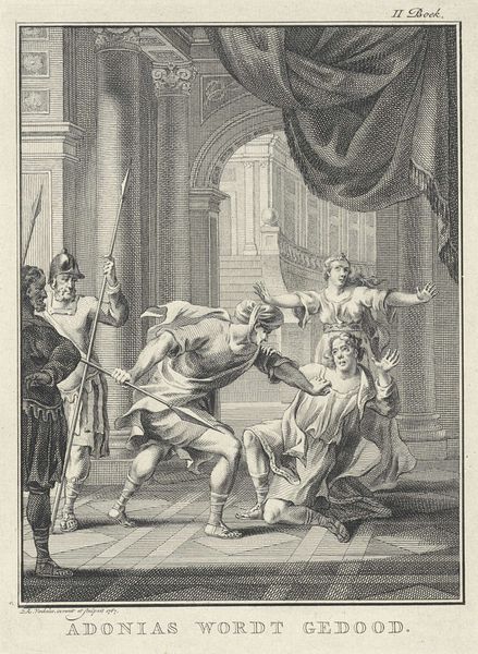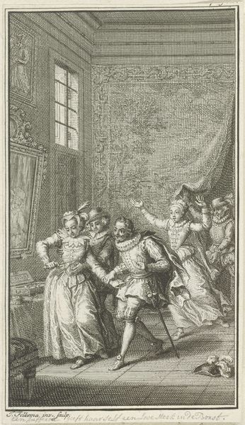 Editor: This is "Agrippa before the House of his Lover," a 1734 engraving by Jan Punt. I’m struck by the detailed line work, especially in the figures' clothing and armour. What's interesting is that it seems that the eye of the artist does not follow a traditional one-point perspective rule. It feels dynamic but slightly unsettling. What do you make of this piece? Curator: The piece is fascinating from a formalist perspective. Notice the artist's manipulation of space; it defies a strictly rational depiction, creating an effect of depth that appears distorted but which introduces drama. Note how the lines direct the eye toward Agrippa, positioning him at the centre of the composition while not following usual proportional guidance, making it clear that Agrippa is the core and soul of this artwork. Editor: I see what you mean. It's almost like a stage set. So what you're pointing out is that distortion is itself part of the communication of the artwork? Curator: Precisely. Look at the balcony. The way it juts out creates tension, as the figures in the balcony are closer to the upper frame than the head of the main subject in the artwork, so the attention may fall to an undesired section. It introduces dynamism within what is otherwise a still, frozen moment. And the textures, consider them. Editor: Textures? Curator: The stark contrast between the smooth surfaces of the building and the busy line work that renders clothing of Agrippa makes that space feel real, material. It makes the action feel immediate, yet trapped and fixed in time. It all points to an intense, emotional narrative being expressed primarily through form. Editor: That’s given me a whole new appreciation for engravings. It's not just about historical storytelling, it’s about the very language of line and space. Curator: Indeed, we should ask, what are the qualities and capabilities of a line as it presents itself and moves the eye? And it is in there where the narrative is told, not outside of it.