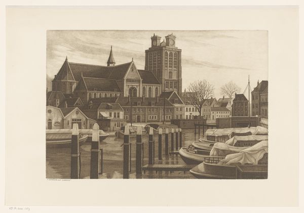 Curator: Before us hangs Willem Wenckebach’s “De Oude Kerk te Amsterdam,” created between 1870 and 1926. The piece combines drawing and printmaking, using pen, ink, and etching techniques to depict a cityscape. Editor: Immediately, I’m struck by the image’s somber yet meticulous nature. The artist's sharp, insistent lines evoke a sense of imposing history—there's such an attention to form and surface detail, almost hyper-realistic. Curator: The lines, precisely as you mentioned, constitute the primary language of the work. Notice how Wenckebach masterfully uses varying densities of etched lines to convey light and shadow. It is really skillful execution that draws one's eye across the composition. Editor: But doesn't that sharp contrast serve to amplify a certain visual tension? The Old Church looms large in the background, while the reflections in the canal water below feel distorted and unsettling, suggesting that the very foundations of this rigid social structure are threatened by modernity and rapid cultural transformation. The very site appears burdened by its own history. Curator: A compelling point. Looking at the rendering of the church's architecture itself, one can clearly observe how the detailed and realistic lines are designed to showcase the solid architectural components. I am not so sure it evokes any feeling beyond pure representational accuracy. The pen lines in particular reinforce a strong sense of depth. Editor: But can’t the realism function as more than mere representation? Given the period in which the etching was created, the detailed focus on the city—particularly a religious site with the weight of colonial history behind it—draws attention to the politics inherent in urban spaces. Who belongs, and who is excluded from that idealized view? The very cleanliness, devoid of the messiness of everyday life, implies a particular, sanitized narrative. Curator: A convincing, albeit cynical, reading. For me, what stands out in "De Oude Kerk te Amsterdam" is the artist’s facility with line. It invites the viewer to appreciate how simple forms, rendered carefully, can create incredibly evocative imagery. Editor: And for me, this image serves as a potent reminder that no image is innocent. Wenckebach's Amsterdam whispers volumes about the complexities and power dynamics embedded within our lived environments.