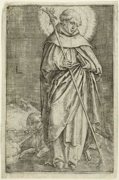 Editor: Here we have Aertgen Claesz. van Leyden's "The Raising of Lazarus", painted in oil sometime between 1530 and 1535. It has such a peculiar stillness to it; the two figures almost seem frozen in time. What initially captures your attention in this work? Curator: Well, isn't it striking how Leyden melds the sacred with the mundane? Lazarus seems almost an afterthought – the focus is certainly on the portrait-like quality of the two figures, caught in this somewhat staged drama. I'm intrigued by the contrast, wouldn't you say, between the somber black robe of the foreground figure and the vibrant red of the figure in the back. What kind of dialogue do you think Leyden is attempting? Is it purely narrative or does it speak to deeper truths? Editor: That's a great question. I was so focused on the surface I almost missed what you described as Leyden’s intended dialog! The contrasting colors and, even more noticeably, how different the men are posed adds nuance. Curator: Indeed. Perhaps he's wrestling with the very idea of faith. The man in the red is partially dressed, barefoot, almost vulnerable, whilst the younger man is cloaked in serious intent. You start to wonder which one believes, and how does belief get translated into action? Editor: It almost looks as if Leyden is questioning rather than celebrating faith. A very insightful painting! Curator: Perhaps… Art, like life, doesn't always offer easy answers, does it? That is its great power!