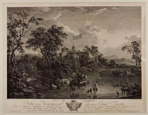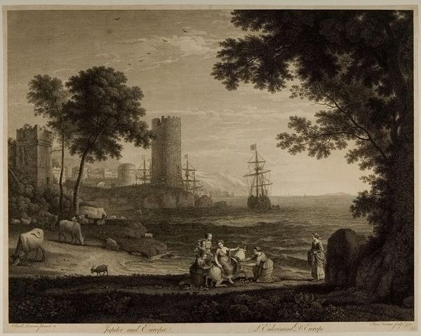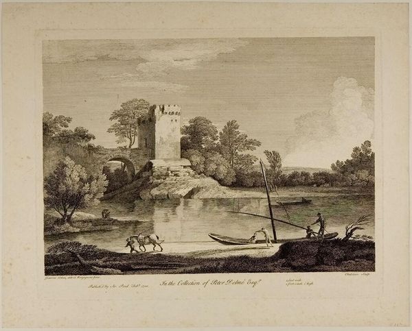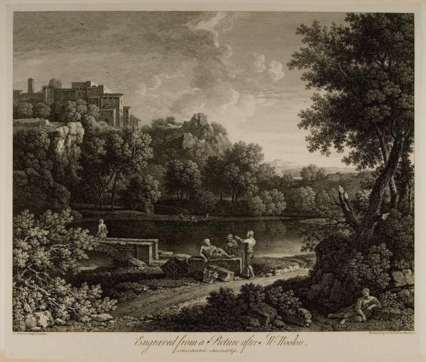 Editor: This print, "View of the Ponte Mole near Rome" by Thomas Major, depicts a pastoral scene. It feels both idyllic and perhaps a little melancholic. What symbols or recurring motifs do you see at play here? Curator: Note the bridge: bridges often symbolize transitions, passages between states. Here, it connects the viewer to a distant, perhaps idealized past, framed by classical architecture. The figures draw water, echoing the cycle of life and the timelessness of nature. Editor: So, the print uses familiar imagery to evoke a specific mood? Curator: Precisely. The composition, the careful balance between light and shadow, the very choice of subject matter, all contribute to a cultural memory of Rome as a place of both beauty and historical weight. What do you make of the figures? Editor: Their small scale emphasizes the grandeur of the landscape. I appreciate how that context shifts my understanding of what I am seeing. Curator: Yes, it all works together to convey a powerful image.