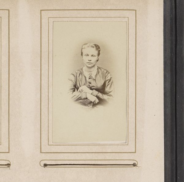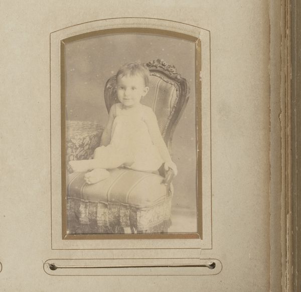 Editor: This gelatin-silver print, "Portret van een zittend kind," created by Jean Günther between 1886 and 1890, feels very intimate. The photograph’s surface shows its age, creating an almost ghostly presence. What's most striking to you about this piece? Curator: What I find compelling is how this ordinary photograph illuminates 19th-century photographic processes and social customs. The labor involved in creating a gelatin-silver print – the preparation of the emulsion, the exposure, the development – it's all a stark contrast to our contemporary digital photography. Editor: So, it's the actual *making* of the photograph you find most significant? Curator: Precisely. Consider the social context. Photographic portraits at this time weren't casual snapshots; they were carefully constructed and posed, and represented a level of social status attainable through the consumption of photography. The subject's clothing, for example, speaks to the economic realities of the sitter's family. What's particularly interesting is the democratization of portraiture afforded by new printing technologies, while access was still demarcated by socio-economic forces. Editor: I hadn't considered the democratization aspect so explicitly. The child's pose and dress certainly indicate some level of social positioning, but against the backdrop of increasing access to photography. Curator: The damage on the print further complicates its reading, suggesting the effects of time and handling and material conditions which speak to our present moment, with the decline of traditional photography and archiving as consumption habits evolve. What does it mean to "save" photographs digitally, without tactility? Editor: This makes me think about our relationship to images today—how we produce and consume them so readily and whether that changes their meaning, and labor, completely. Curator: Exactly. Looking at this photograph through the lens of its material production reveals layers of social and cultural meaning, asking us to critically assess the art, value, and labour of images today.