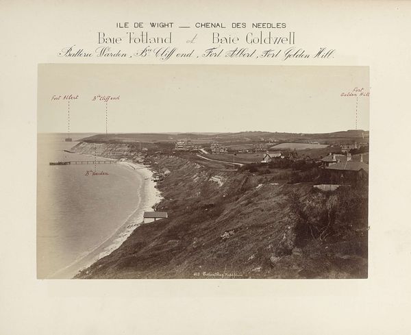 Curator: This is George Washington Wilson's photograph, "The Beach, Dawlish, Devonshire, England," currently residing at the Harvard Art Museums. Editor: The sepia tone gives it a nostalgic feel, a sense of faded grandeur, doesn't it? Curator: Indeed. The composition is particularly striking, the way the railway curves into the frame draws the eye. It mirrors the coastline almost. Editor: And speaks to accessibility; the railway brought leisure to this once quiet beach, didn't it? Who had access, who didn't. Curator: Certainly, it is a meditation on space, technology, and society. The light, though muted, highlights textures. Editor: I see a narrative of change, privilege, and the commodification of leisure embedded in its composition. Curator: A compelling contrast in viewpoints. It really shows how multifaceted a single image can be. Editor: Absolutely, and how art invites us to question and reinterpret continually.