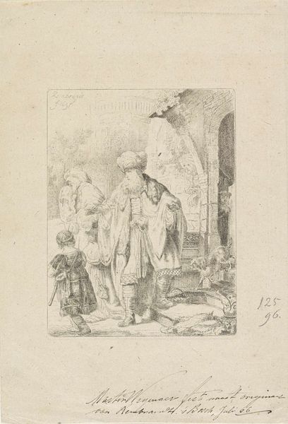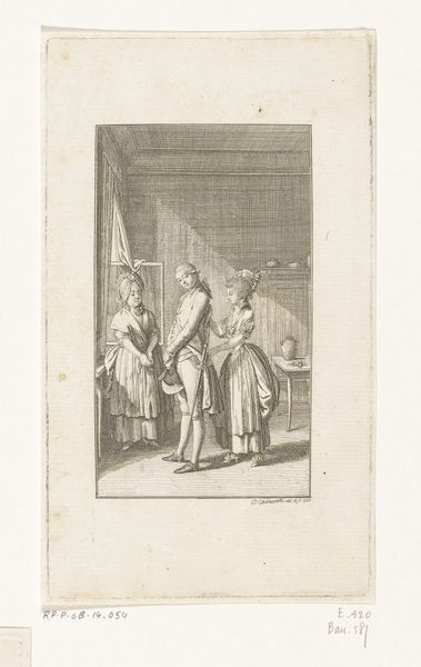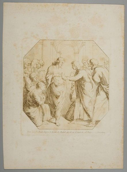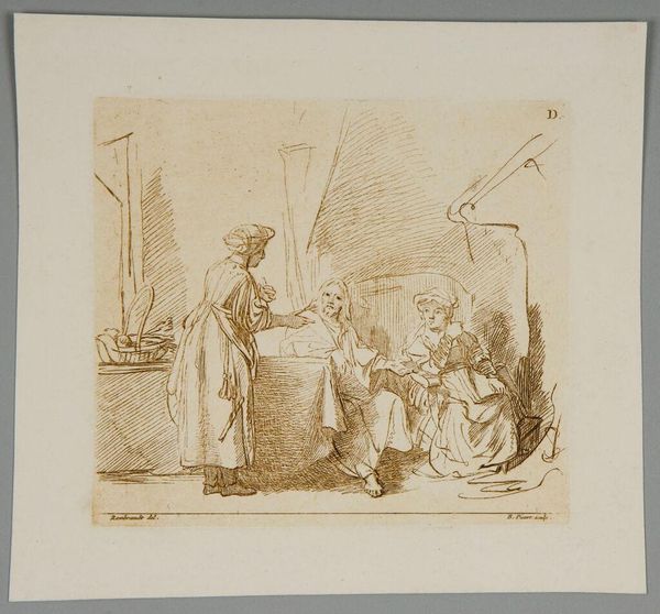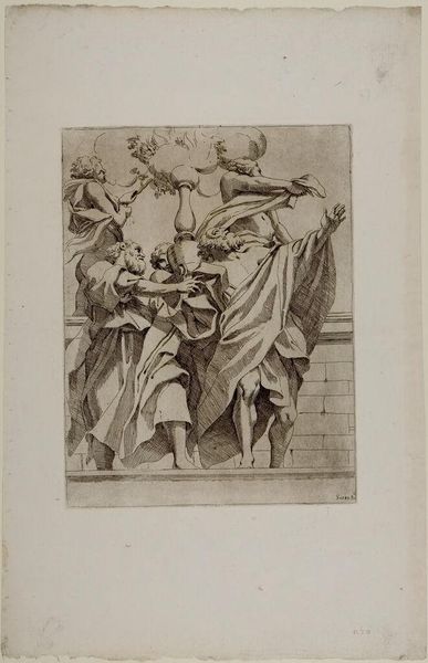 Curator: This is Bernard Picart's "Three Holy Women," a delicate etching held at the Harvard Art Museums. Editor: The composition strikes me as dynamic, almost urgent; their garments billow, suggesting movement. Curator: Indeed, Picart's masterful use of line creates a sense of flow. Note how the drapery defines the forms, almost concealing the bodies beneath. It's a study in contrasting textures. Editor: I find myself wondering about these women. Are they fleeing something? What does it mean to depict them as holy, yet also seemingly in distress? Is this artwork a commentary on gendered expectations of piety? Curator: Perhaps. Or, considering Picart's skill as a draughtsman, the work is more about the interplay between line and form, the delicate dance of light and shadow. Editor: For me, it highlights how even seemingly straightforward depictions of religious figures can evoke deeper questions about power and representation. Curator: A compelling thought, especially when considering Picart's artistic choices. Editor: Ultimately, it's a piece that lingers in the mind.
