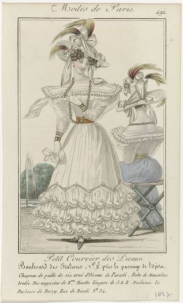 Curator: This delicate watercolor print is titled "Petit Courrier des Dames, 15 juin 1829, No. 645 : Chapeau de paille de riz..." It's from 1829 and is part of the collection at the Rijksmuseum. Editor: It's incredibly intricate! The detailing on the dresses is amazing. There's a lightness to it, even though the fashions seem so elaborate. Curator: Absolutely. These prints were incredibly popular as a way to disseminate fashion trends. Consider the materials described in the title itself – rice straw hats, cotton dresses, tulle trimming, revealing a complex economy around textile production. It speaks to a growing consumer culture in 19th-century Paris and the role publications played in shaping desire. Editor: Fashion very rarely exists in a vacuum. The very publication, the "Petit Courrier des Dames", positions fashion as information to be consumed and displayed. Where and how these images were disseminated would impact their viewership greatly, no? Curator: Precisely. These fashion plates not only showcased current styles but also promoted ideas of social status and Parisian identity. They also created work. This image had to be printed, painted with watercolors, sold and distributed, often by women. Consider all the hands involved in the production, distribution, and even the wearing of such fashions! Editor: It's a fascinating look at the interplay between art, commerce, and social performance. I never really think of these dainty artworks being tied to wider markets for luxury goods or providing opportunities in creative professions. Curator: It forces us to consider the economic landscape embedded within seemingly frivolous images. The labour practices needed to produce such highly intricate gowns and hats. The political dimension of displaying a dedication to personal dress. Editor: Well, I’ll never look at a fashion plate the same way again. The materials and labor become so visible. Curator: And, I’ll have a heightened awareness to social and economic considerations impacting public life for 19th century Parisians!