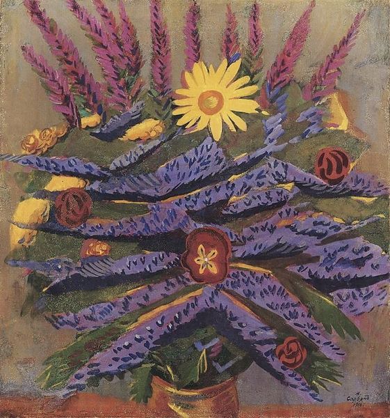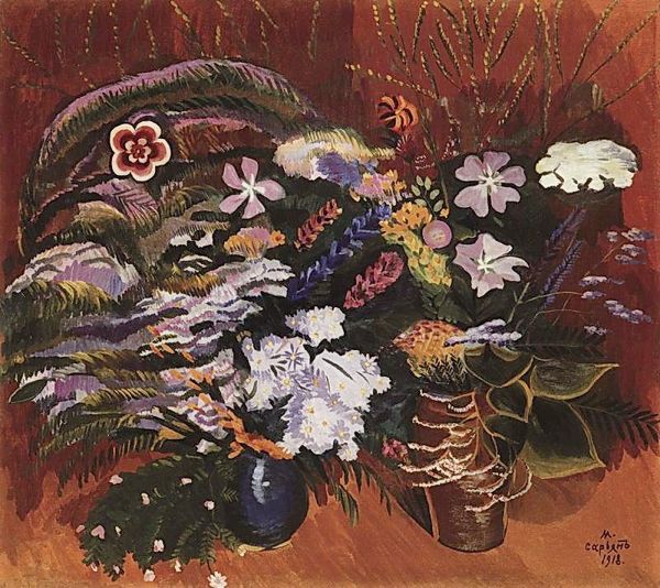 Martiros Sarian made this painting of a bouquet in a blue vase with watercolor, sometime around 1916. Look at how the red of the flowers is echoed in the tabletop, and the dark blue of the vase pulls forward. The beauty of watercolor is in the way the colors can flow together, creating soft edges and unexpected blends. The way Sarian has used the medium here, it’s all about immediacy and letting the paint do its thing. See how the petals are built up from circular marks? It’s as if each flower is a little world. The blue vase anchors the composition, providing a solid base for the riot of color above. I'm reminded of Emil Nolde, with that same love for expressive color. But Sarian brings his own distinct vision, a kind of optimistic, radiant energy. It's a reminder that painting is always a conversation, an exchange of ideas that spans generations.