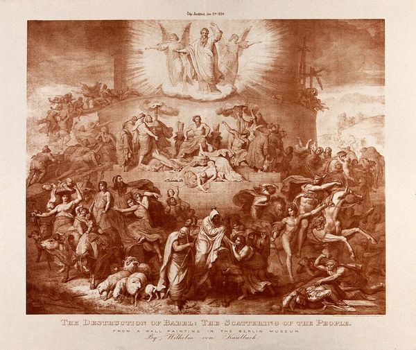 Editor: So, this is "Decoratie van de troonzaal in 'Le Luxembourg' La France sous les Chretiens les Valois et les Bourbons'", based on Lehmann, printed between 1851 and 1893 by Ferdinand Leenhoff. It's an engraving. There's a lot going on here – battle scenes, figures standing tall, even a winged figure up top. The overall tone feels quite grand and historical, almost like a tapestry, even though it's a print. What strikes you most when you look at this? Curator: Initially, one is drawn to the disposition of forms and the linear precision achieved through the engraving medium. Observe how the composition is meticulously structured, divided into distinct horizontal registers. Note how this layered approach contributes to the artwork's overall visual balance. Editor: I see what you mean about the registers – the bottom section is full of chaos and fallen figures, while the top seems more ordered and idealized. It is like two halves. How do you interpret that contrast? Curator: Precisely. It is the skillful deployment of contrasting textures that guides our eye. Consider, for example, the dramatic chiaroscuro effects created by the artist. By strategically varying the density and orientation of engraved lines, we see three-dimensionality and surface quality being suggested and articulated. We discern a nuanced interplay between light and shadow that is critical to decoding meaning in terms of structuralist binary opposites of order and chaos. Editor: It's almost like a visual representation of France's history with its rises and falls. It also creates an upward flow that our eyes follow through each section. I definitely appreciate how the visual composition and technique contribute to how we feel about the historical moment it tries to capture. Curator: I would concur with your perception. By extension of formal assessment to thematic possibility we discover layers of content unavailable by consideration of theme only. A truly remarkable instance of image making!