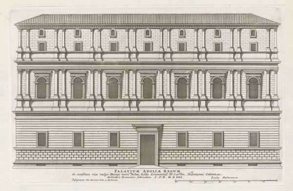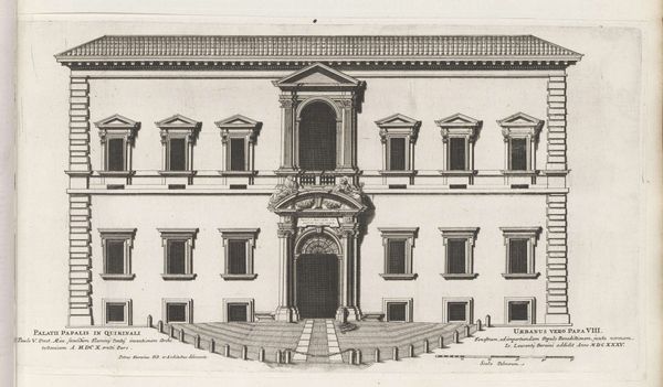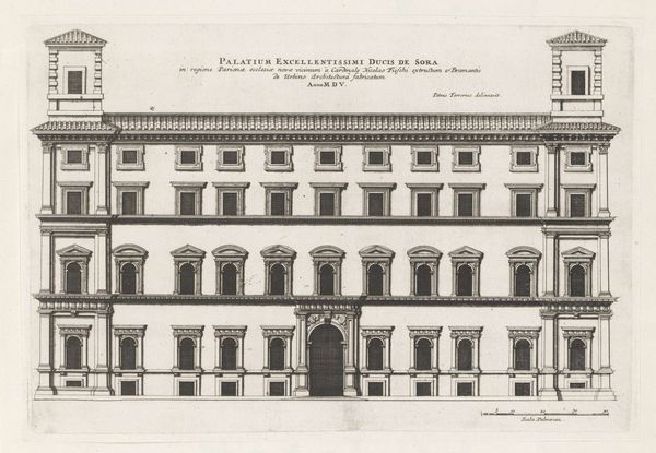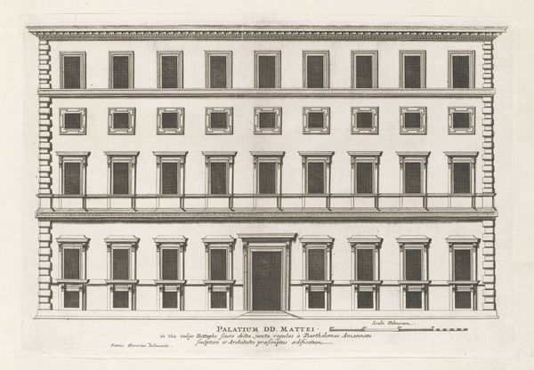 Giovanni Battista Falda created this print of the Palazzo Borghese in Rome using etching techniques. The lines are meticulously incised into a metal plate, likely copper, which would then be inked and printed. What's fascinating here is the contrast between the subject and the process. The Palazzo represents the height of aristocratic power and wealth, made possible by the labor of countless artisans and workers who quarried the stone, carved the ornamentation, and constructed the building. Falda's print reduces this grand architectural statement to a series of delicate lines, a more democratic medium capable of wider distribution. The printmaking process itself also involved skilled labor, demanding precision and technical expertise. This emphasizes a tension: while celebrating the opulence of the Borghese family, the artwork is inherently tied to the world of craft and production. Falda's work bridges the gap between fine art and the realities of material creation.