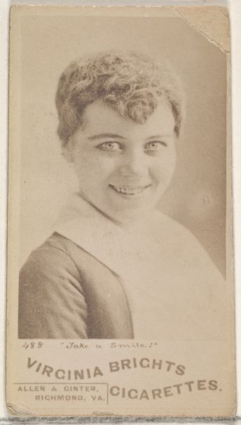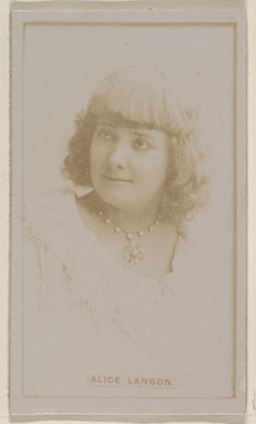 Curator: This is a cabinet card from 1890, featuring actress Ida Mulle. It comes from the "Actresses" series, N245, a promotional item issued by Kinney Brothers for Sweet Caporal Cigarettes. Editor: It has such a faded, almost ghostly quality. The way the light catches her face, the wispy hair and delicate flowers – it feels like peering into a very distant past, but the actress feels familiar, maybe as a symbolic ancestor for all modern actresses and popular entertainment? Curator: Interesting. Considering this card's origins as cigarette advertising, we might look at Ida Mulle's image as a carefully constructed representation of feminine allure and desire. It speaks volumes about how companies shaped societal ideals. The flowers atop her head may represent idealization and virtue in marketing this addictive product. Editor: And consider the scale and production: the print and photographic elements combined into this small card. It’s a mass-produced object meant to be handled, collected, traded. Its value lies not in its uniqueness but its availability – spreading the image, the name “Ida Mulle,” and of course the Sweet Caporal brand into as many hands as possible. A different order of iconography! Curator: Exactly. She is presented like an emblem. Her soft features, combined with the period’s typical portrait style, suggest beauty and a degree of fame as qualities that elevate the mundane tobacco. Her persona connects back to those consumer expectations in a subtle interplay. Editor: It really reveals a snapshot into late 19th-century consumer culture, showing us how art and celebrity could be so directly intertwined with industry, labor and mass culture, and its symbolic constructions. Curator: Indeed. It's amazing how an actress in the past can embody all that she embodies when we place ourselves into the time of production for mass consumption, allowing us to revisit what images and symbols continue on even now. Editor: It certainly makes me want to examine the production elements involved when someone promotes anything!