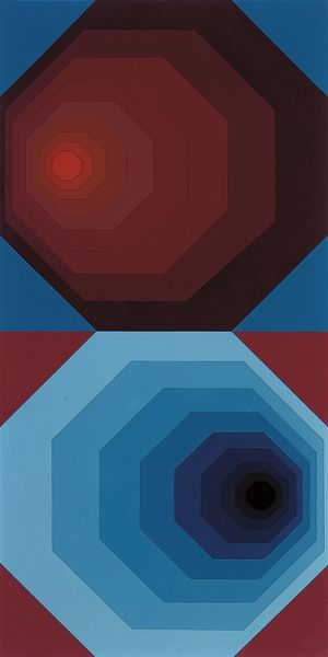 Curator: We’re looking at “Okto-duo,” a mixed-media sculpture by Victor Vasarely. Editor: Whoa, it’s like staring into infinity, or maybe two parallel universes stacked one atop the other. Cool blue fading to a dark heart on top, fiery magenta burning to a white-hot core below. What's it made of? Curator: As a mixed media work, the exact construction of “Okto-duo” requires a closer inspection but, broadly, we can appreciate it as an excellent example of Op Art. Note how it utilizes nested geometric forms and color gradients to trick the eye. Vasarely played a pivotal role in popularizing this style. Editor: Trick is the word. It messes with your perception, like some kind of visual echo chamber. And placing the cooler, airy blue above the dense violet hue creates a precarious kind of equilibrium, doesn’t it? Almost feels unstable despite the symmetry. Curator: The instability is precisely the point, I think. Op Art, emerging mid-20th century, sought to destabilize traditional art viewership, rejecting illusionism, narrative, and self-expression, to explore how perception itself is culturally and mechanically constructed. Vasarely's work exemplifies this pursuit, almost a democratization of art appreciation as the viewers participation is required to activate the piece. Editor: True. It’s less about *what* I'm looking at, and more about *how* I'm looking. Makes you wonder what other tricks our minds play on us every day. This feels especially resonant in our digital age of deepfakes. So, are those color choices deliberate or just, you know, nice? Curator: While the color combination has a striking visual appeal, I suspect the careful choices have wider historical and theoretical connections too. Consider the political role of colors within modern imagery, for example... but that is something to discuss further. Editor: Well, either way, it makes you question the very ground beneath your feet, visually speaking of course! A nice mind bender. Curator: It invites introspection—not just on what we see, but how society shapes our vision. Thank you for sharing that with me. Editor: My pleasure! And thanks for expanding my vision, one geometric illusion at a time.
