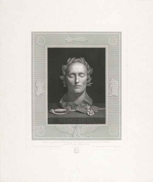 Editor: Here we have Lazarus Gottlieb Sichling's "Death Mask of Napoleon." There's a quiet solemnity to it. I find myself wondering about the items placed alongside the bust -- the sword and the medal -- almost like relics. What do you see in this piece? Curator: It's a fascinating encapsulation of power and mortality, isn't it? The laurel wreath, a symbol of victory, contrasts poignantly with the stillness of death. The objects at the base, you’re right, do feel relic-like, prompting reflections on legacy. I sense the artist almost inviting us to ponder how we remember the greats and what remains. Do you feel that too? Editor: I do. It’s a powerful visual statement about how we immortalize figures, even in death. Thanks for this perspective! Curator: My pleasure. It's a reminder that behind every legend lies a human story.