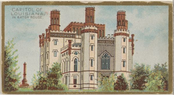 Curator: This lithograph, dating to 1890, presents an "English Castle" as part of the "Habitations of Man" series, distributed by W. Duke, Sons & Co. Editor: My immediate reaction is to the textures. The surface has this wonderful, almost tactile quality. It feels like there’s a real layering of materials at play. Curator: The work exemplifies the aesthetic sensibilities of the academic art style, where clear and well-ordered architectural details serve to portray a romantic and somewhat nostalgic scene of England. Note how the structural components such as walls and towers communicate the essence of 'castle' as concept rather than any particular place. Editor: Indeed. I am particularly struck by how the work functioned. These were not exactly gallery pieces; instead, they promoted tobacco. The labor involved in the crafting of such chromolithographic prints, intended for wide consumption, brings the economic processes of artistic creation into view. Curator: Very insightful. Furthermore, one should observe how the color usage contributes to the representation. The contrast of pale yellow and sky blue, paired with linear exactitude, makes the depicted architectural elements communicate grandeur and timelessness. Editor: Exactly! It’s fascinating how these commercial prints blurred the line between fine art and industrial production, where artists contributed to mass culture, yet their labour became just another element in the cycle of manufacturing and advertising of tobacco products. Curator: Absolutely. Looking at the semiotic content further, note how such scenes are imbued with values about tradition, lineage, and stability, something possibly linked to a target audience’s preferences during that time. Editor: Thinking about material use is intriguing. While ostensibly representing durable stone and earth, the print relies on flimsy paper. That opposition tells a powerful story of value and the material conditions of viewing culture in a consumable way. Curator: So, to summarise, a seemingly straightforward depiction of an “English Castle” on closer examination reveals much about composition, distribution, cultural encoding, and even social value. Editor: A reminder that art's impact is often rooted in tangible production and our evolving engagement with materials in varied social conditions.